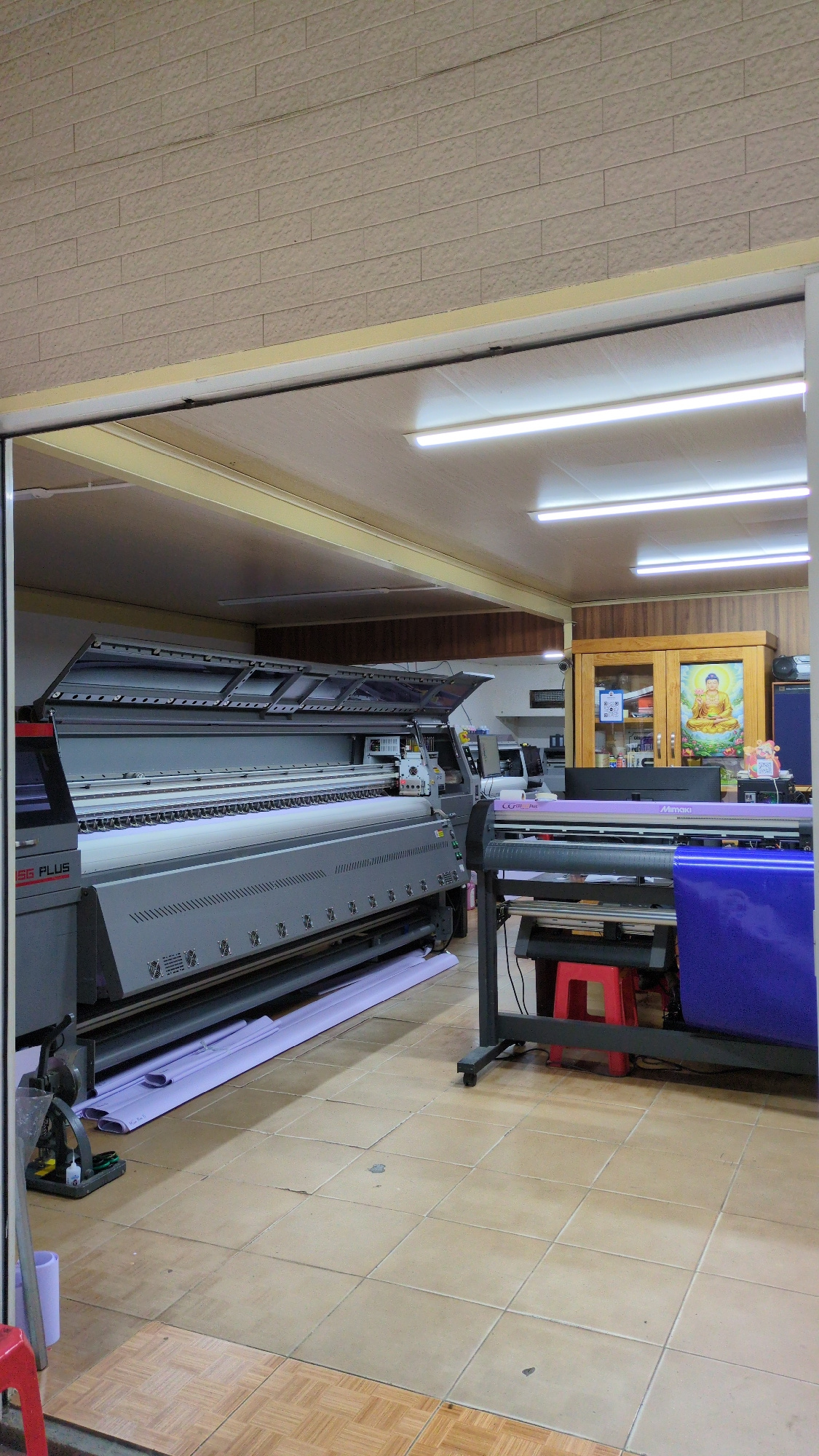 The image depicts the interior of a printing shop, likely in Da Lat, Vietnam. A large-format printer occupies the center, loaded with purple material. A cabinet stands near the back, displaying a gold…read more