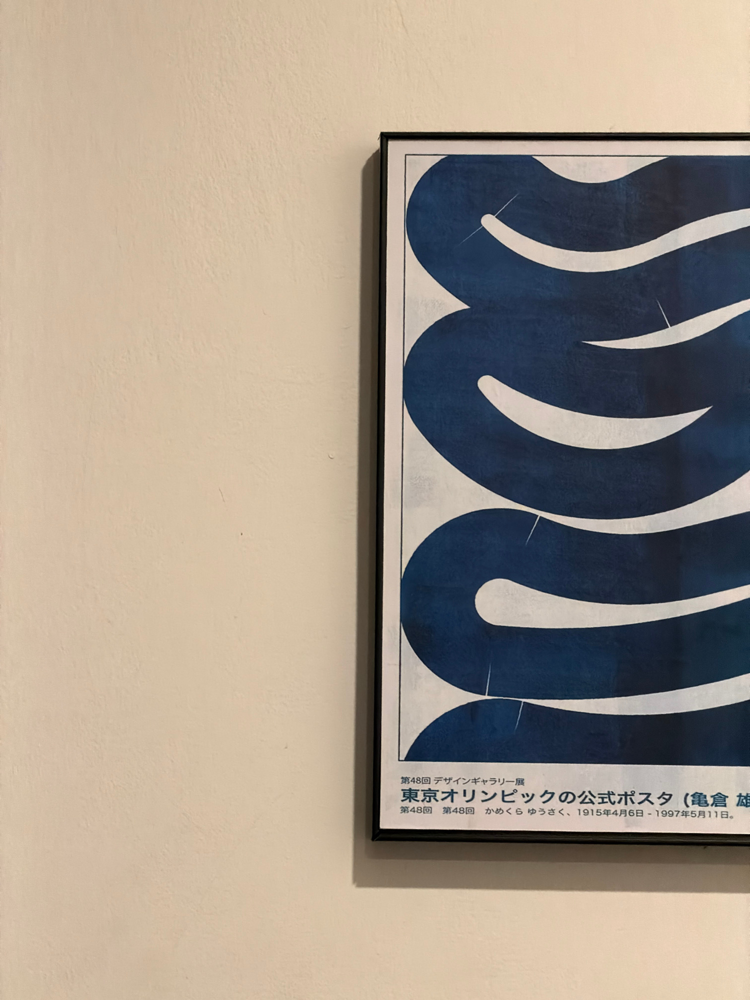 A framed poster is depicted hanging on a light-colored, textured wall in an indoor setting. The poster features a large, abstract design dominated by sweeping, wave-like or calligraphic forms in deep…read more
