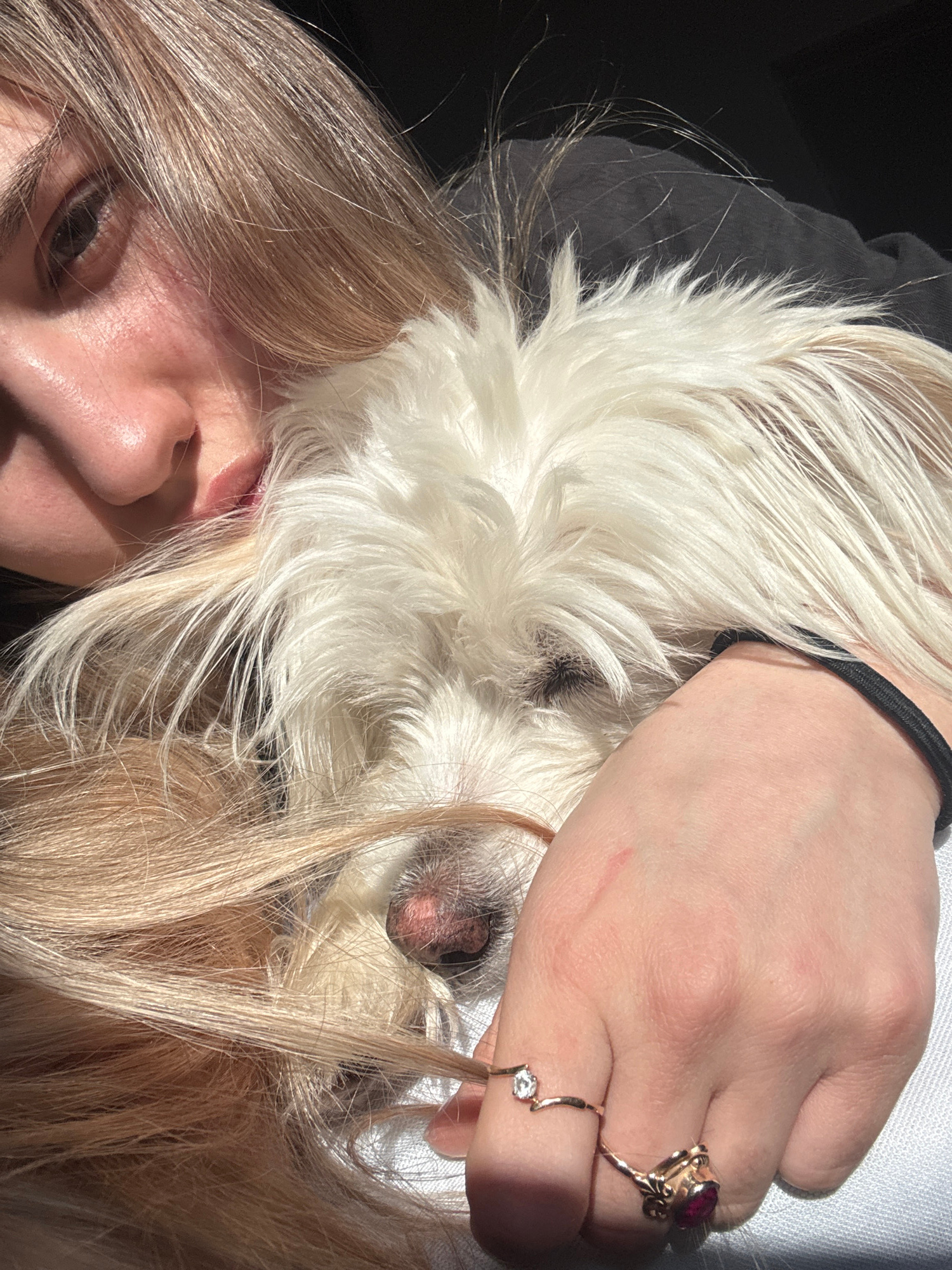The image depicts a close-up, slightly angled view of a person holding a small, white, long-haired dog. The person, with light blonde hair, has their face partially visible in the lower left corner of…read more
