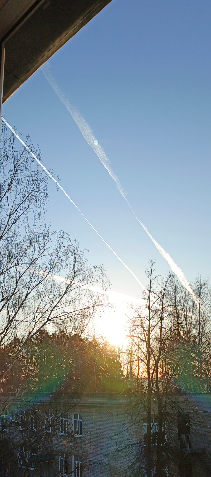 The image shows a view from a building in Chaikovsky, Russia, looking out over a landscape during sunrise. The sky is a clear blue, streaked with contrails from airplanes. In the midground, a row of b…read more