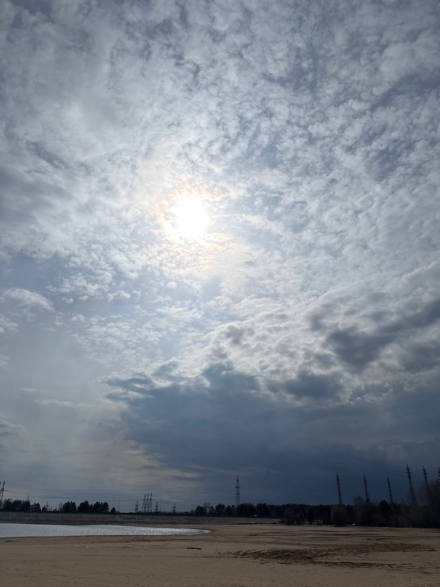 The image shows a view upwards towards a bright sun obscured by a sky filled with altocumulus clouds. The horizon line, tilted to the right, reveals a landscape with power lines and trees against a sk…read more