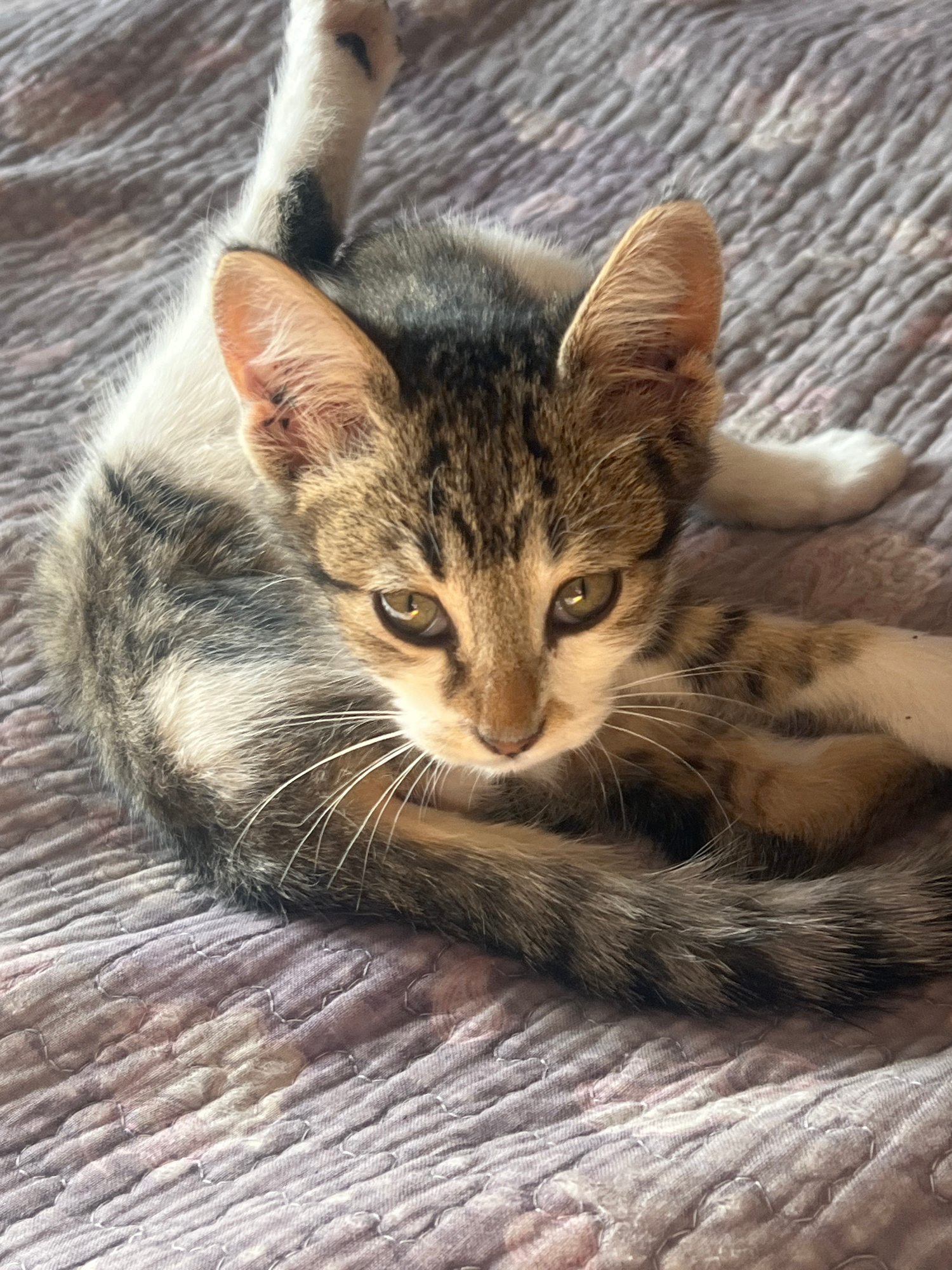 A kitten lies on a quilted, textured, lilac-colored surface. The kitten's fur is a mix of brown tabby, white, and gray. It has amber eyes and white whiskers. The kitten is looking up and appears to be…read more