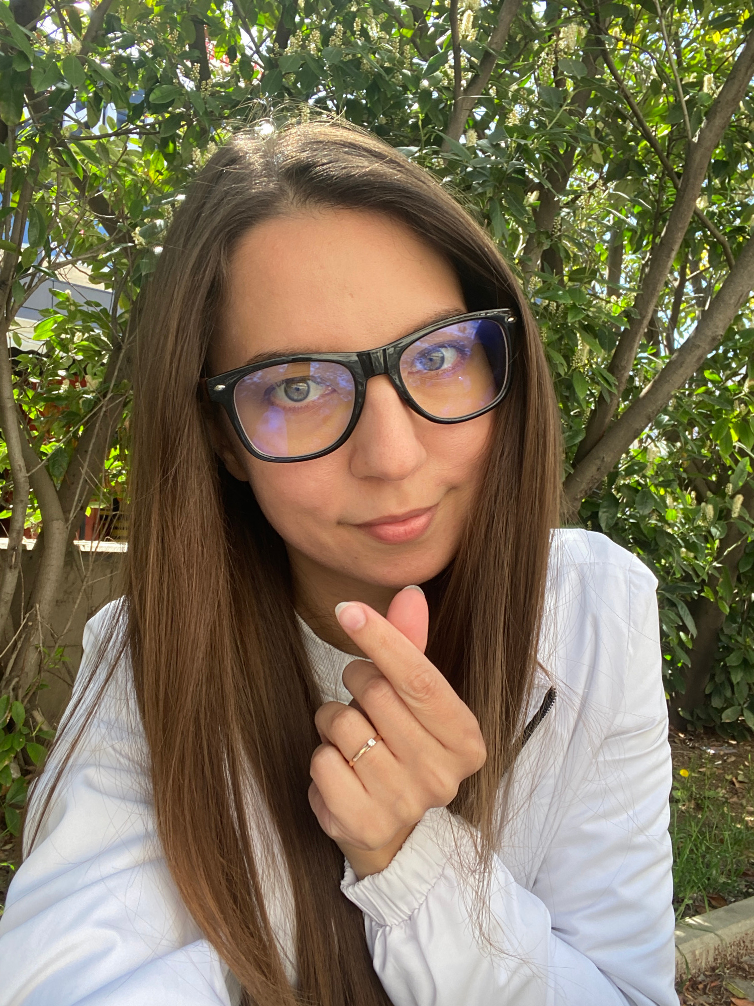 A woman with long brown hair and glasses is posing in an outdoor setting. She is wearing a white jacket and a ring on her finger. The background consists of green leaves and tree branches, suggesting…read more