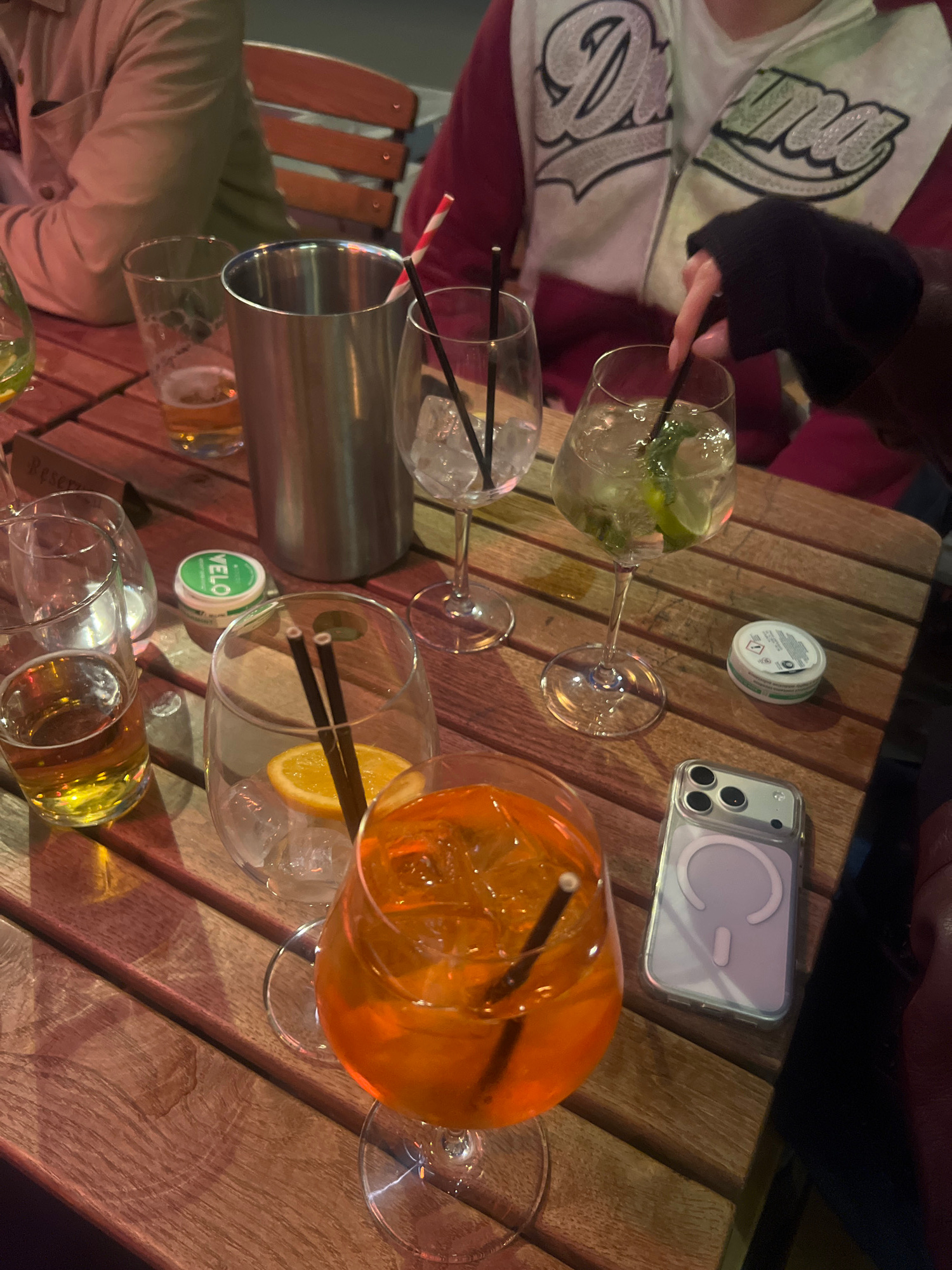 The image captures a casual gathering on a wooden table, likely at an outdoor setting in London, United Kingdom. Several glasses are present, some filled with beverages: one contains a clear liquid wi…read more