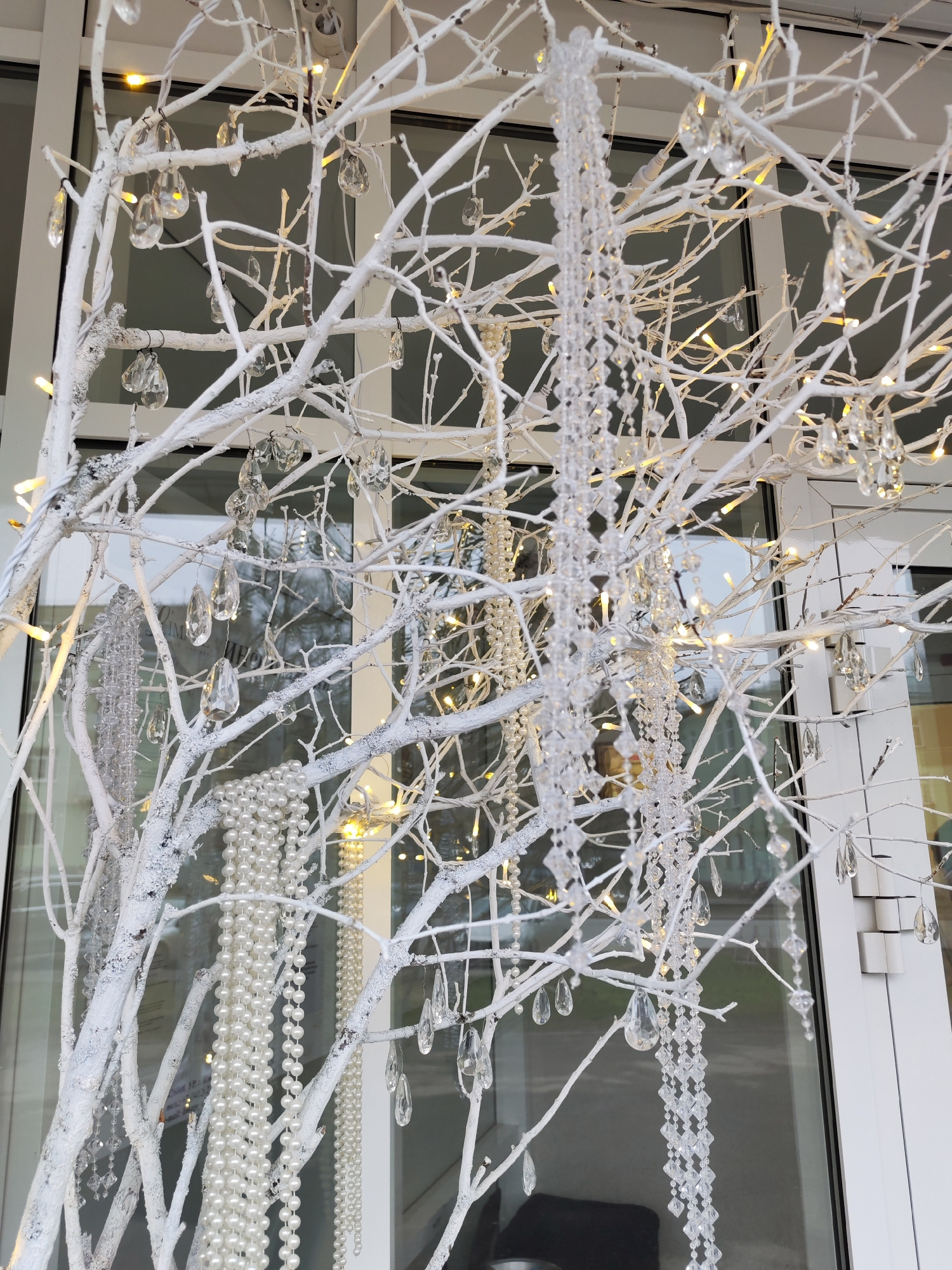 This image captures a decorative display featuring white-painted branches adorned with various sparkling elements. The branches, which appear to be real tree branches or replicas, are painted a starkβ¦read more