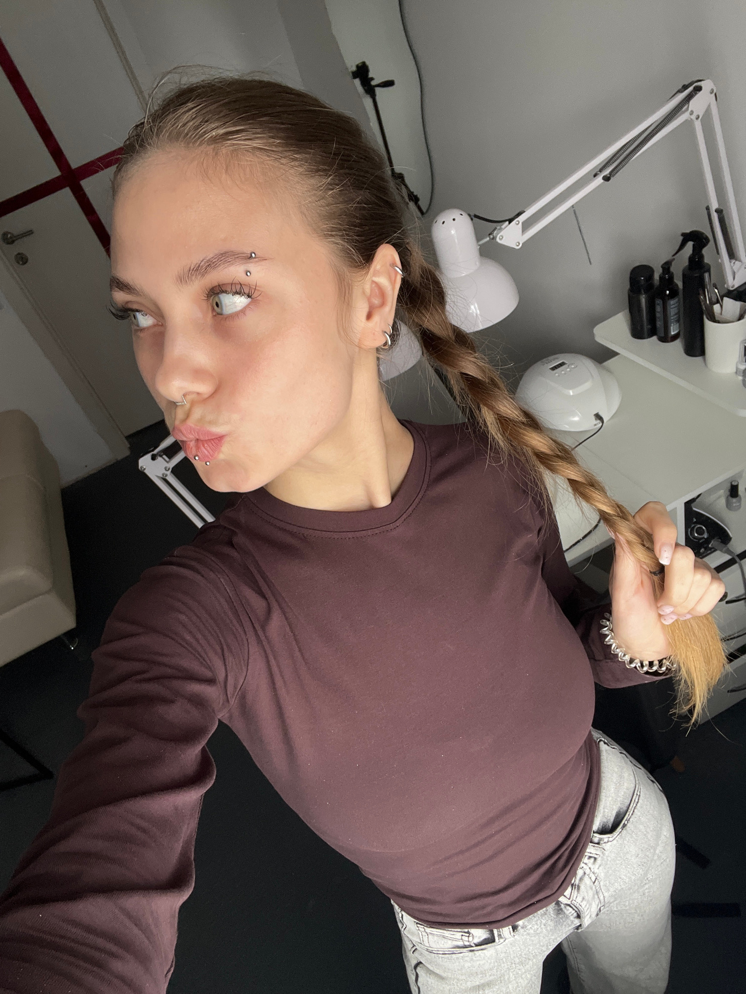 A young woman with light brown braided hair, wearing a maroon long-sleeved shirt and light-colored jeans, is holding the end of her braid. She has eyebrow and lip piercings. The background includes a…read more