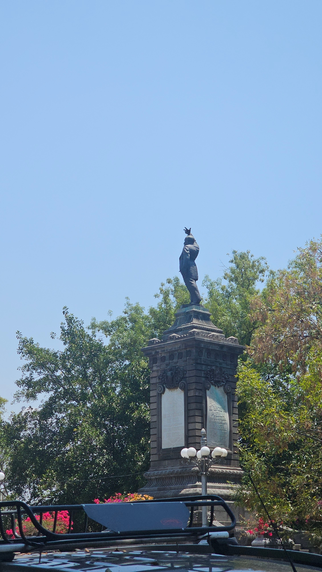 The image displays a grand public monument set against a clear, bright blue sky. A bronze statue of a distinguished man stands prominently atop a tall, ornate stone pedestal. The figure is depicted inβ¦read more
