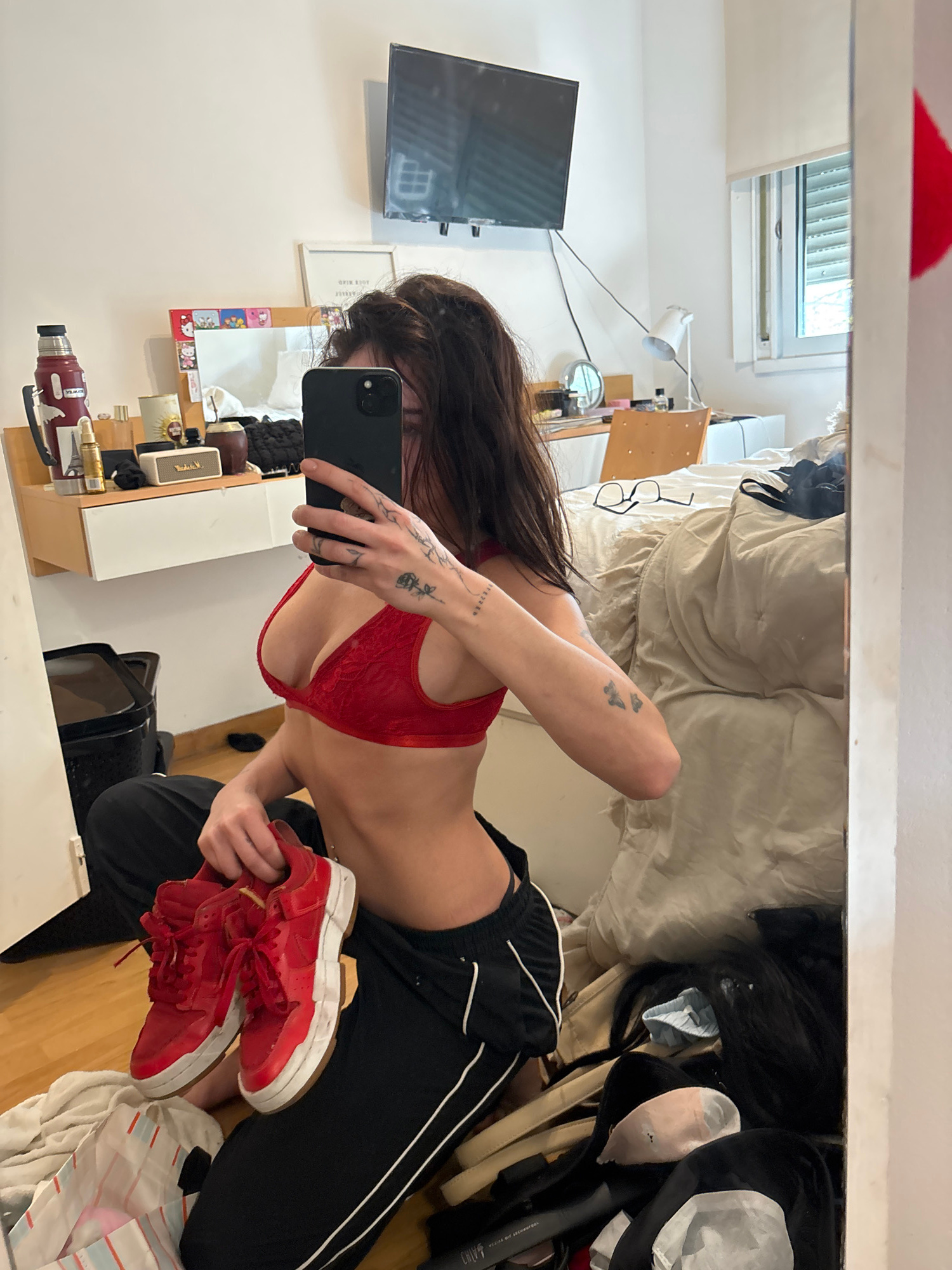 A young woman poses for a selfie in front of a mirror inside an apartment. She is wearing a red lace bra and black sweatpants with white stripes down the sides. She is holding a pair of red sneakers i…read more