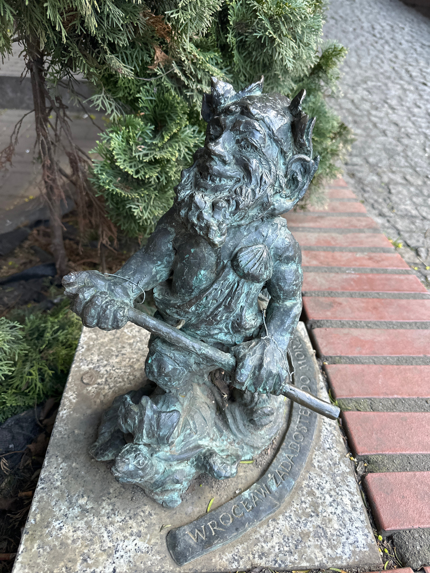 A ground-level, slightly tilted shot reveals a weathered, bronze dwarf statue from Wrocław, Poland. The statue, positioned on a stone base, depicts a gnome-like figure with horns, holding a long pole.…read more