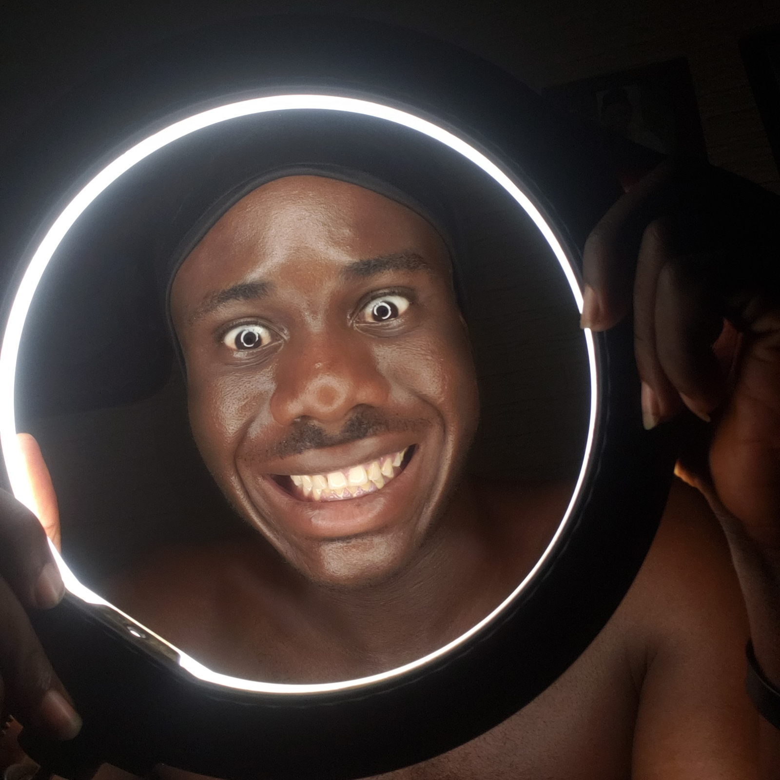 A man is holding a ring light, with his face centered within it. He has dark skin and is smiling broadly, showing his teeth. His eyes are wide. His bare shoulders and chest are visible. The background…read more