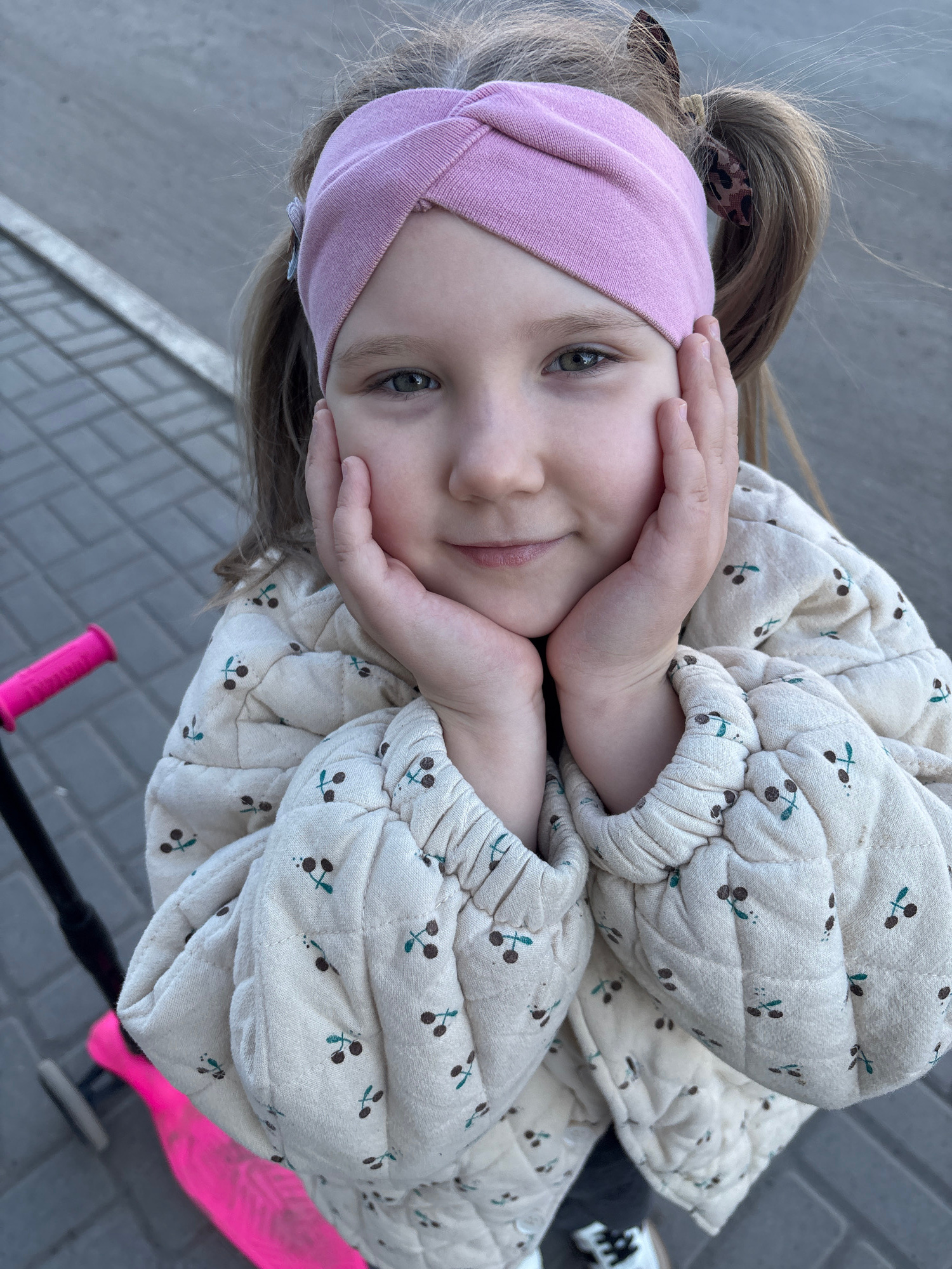 This brightly lit, slightly tilted, portrait-style photograph captures a young child outdoors in Chaikovsky, Russia. The child, likely a girl with light brown hair pulled back into a ponytail, looks d…read more