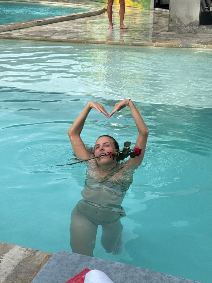 This image depicts an outdoor swimming pool scene in Ungasan, Indonesia. A female subject, appearing adult, is partially submerged in light blue pool water, positioned centrally. She has her eyes closed, head slightly tilted back, and mouth open, holding the stem of a red rose with two blooms between her teeth. Her arms are raised above her head, with hands joined to form a heart shape. She is wearing light-colored swimwear. In the upper background, the lower legs and bare feet of a second individual are visible, standing on a wet, light-colored concrete surface adjacent to the pool. Behind this individual, another pool area with slightly darker blue water is visible, separated by a concrete edge. A wall with faint, colored markings forms the distant background. In the immediate foreground, at the bottom left, a dark grey rectangular object, possibly a towel or mat, is partially visible, upon which indistinct red and white objects rest. | Open Wire