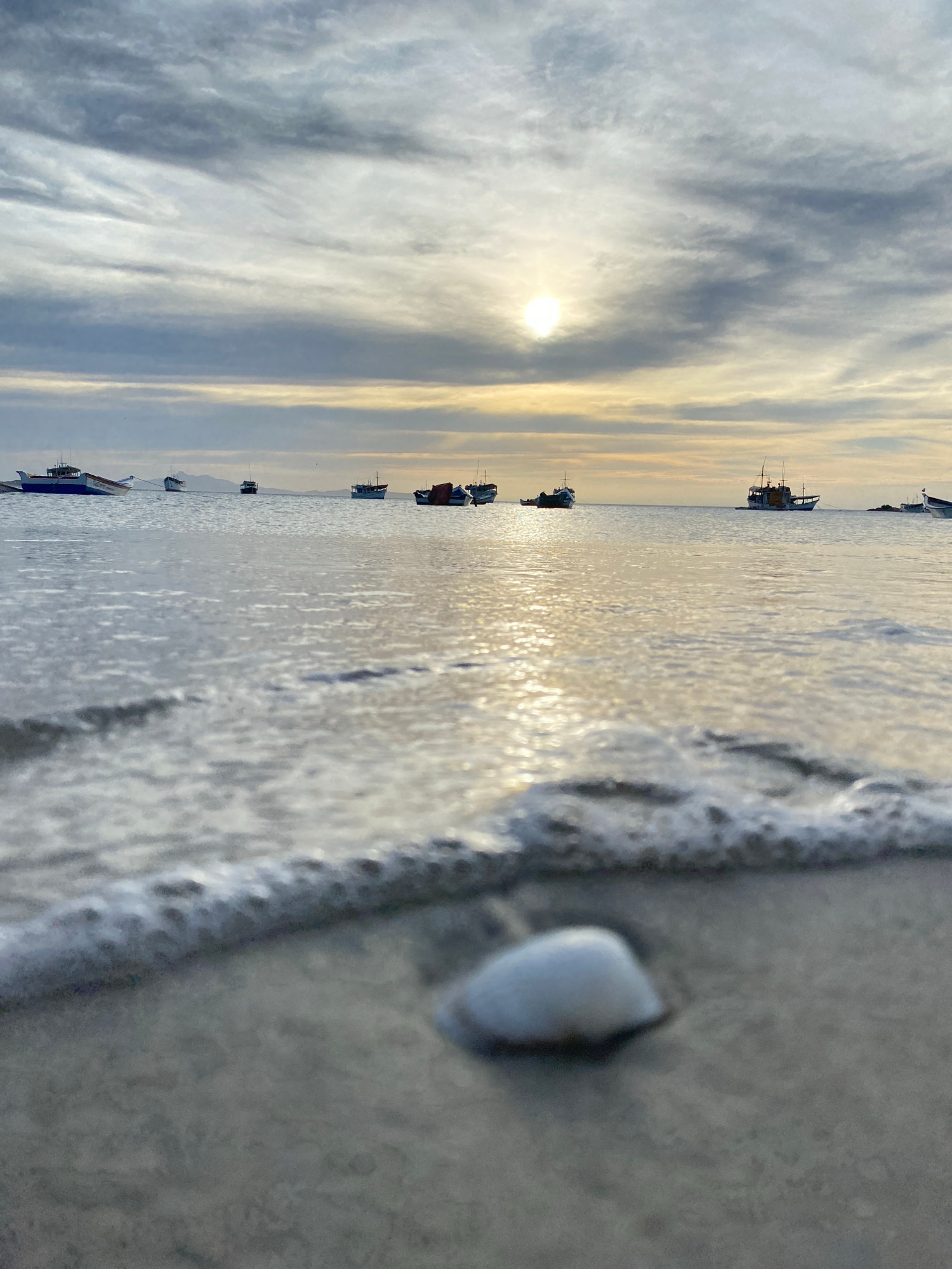 The image captures a serene coastal scene in Juan Griego, Venezuela. In the foreground, a small, light-colored seashell rests on the wet sand. The tide is coming in, with gentle waves lapping at the s…read more