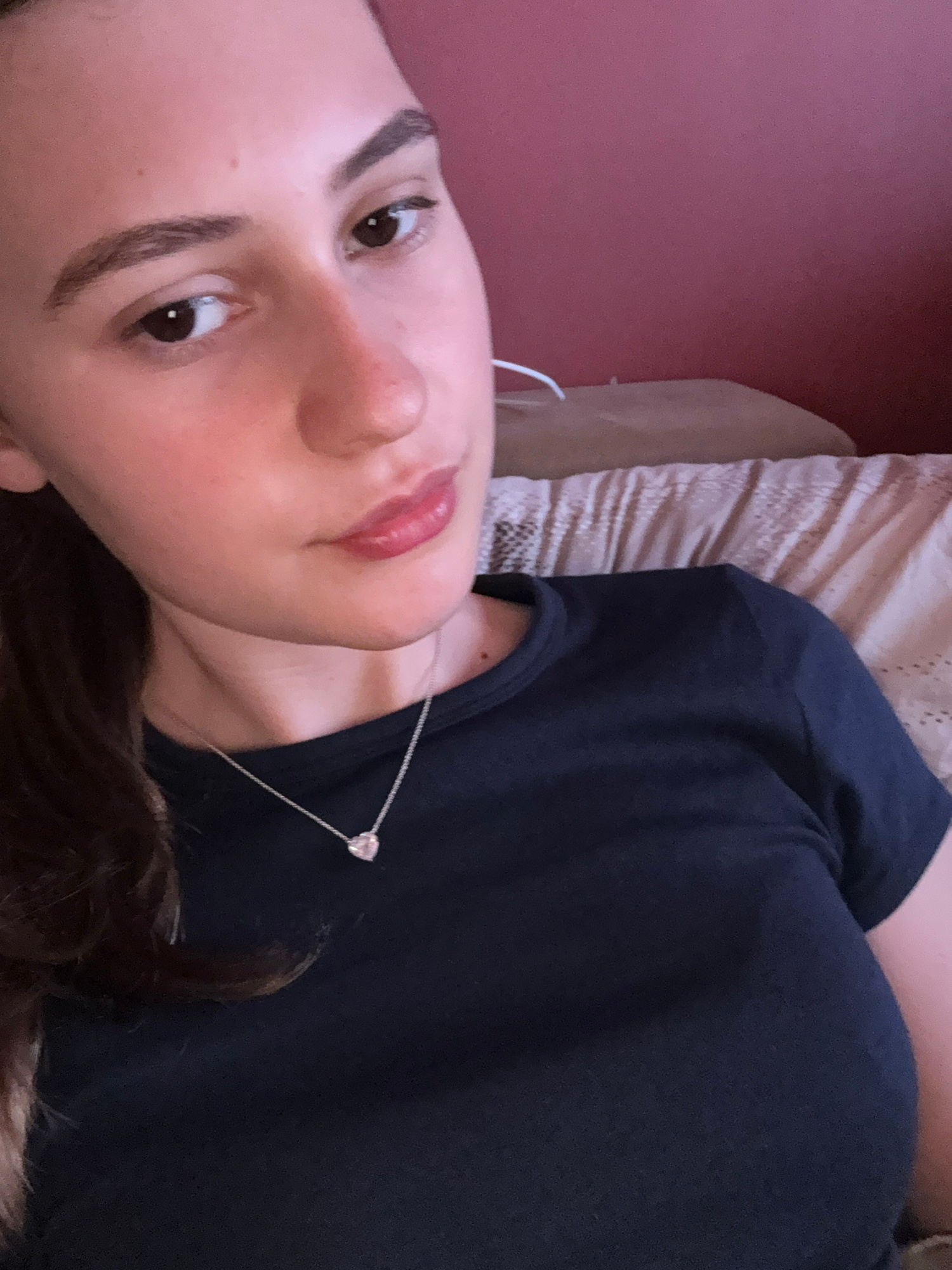 A young woman with dark brown hair is lying down. Her head is tilted to the left. She is wearing a dark blue T-shirt and a silver necklace with a heart-shaped pendant. The background includes a pink wβ¦read more