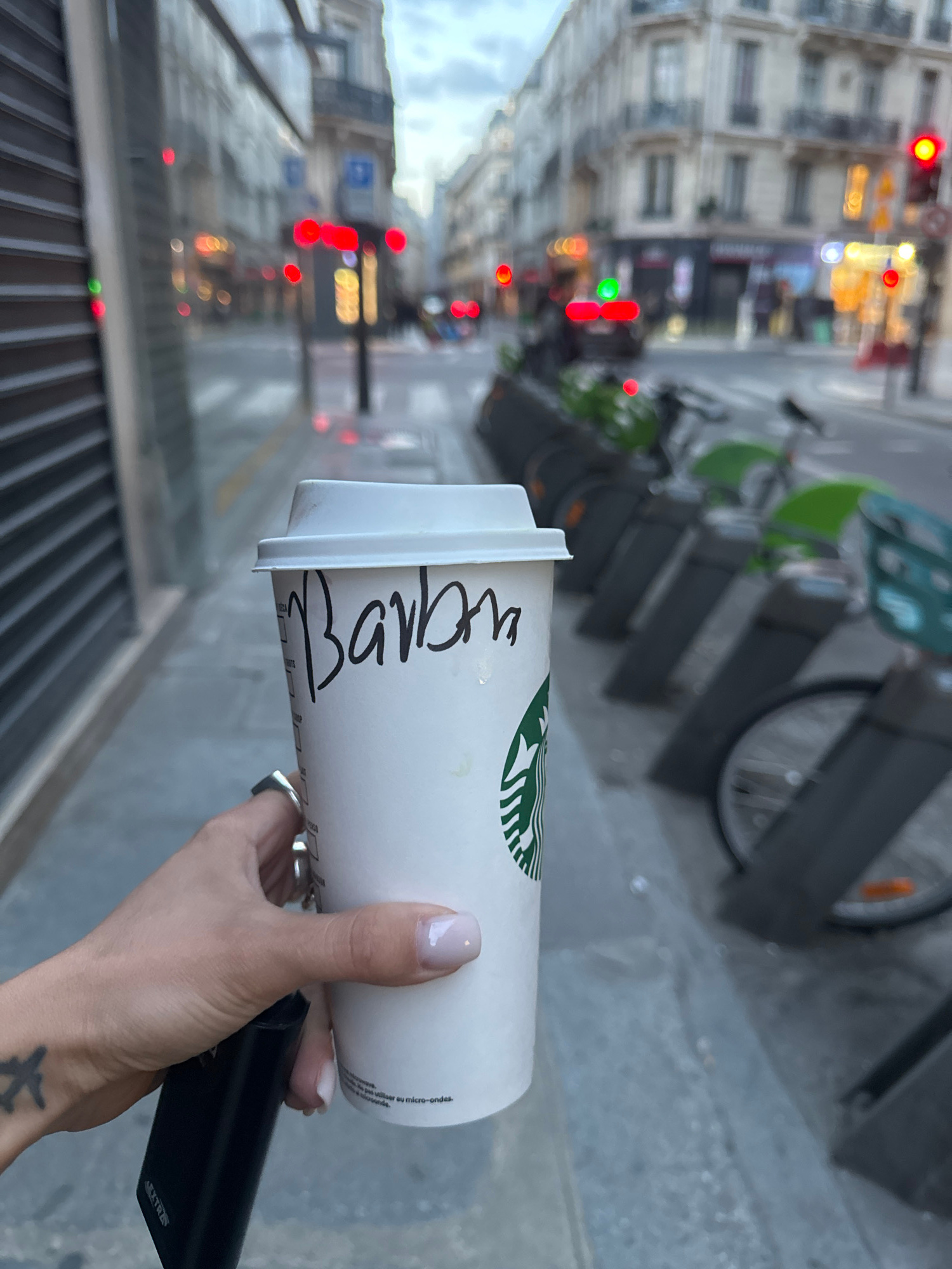 The image captures a close-up of a person's hand holding a white Starbucks coffee cup and a black rectangular electronic device, set against the backdrop of a busy urban street. The hand, which has li…read more