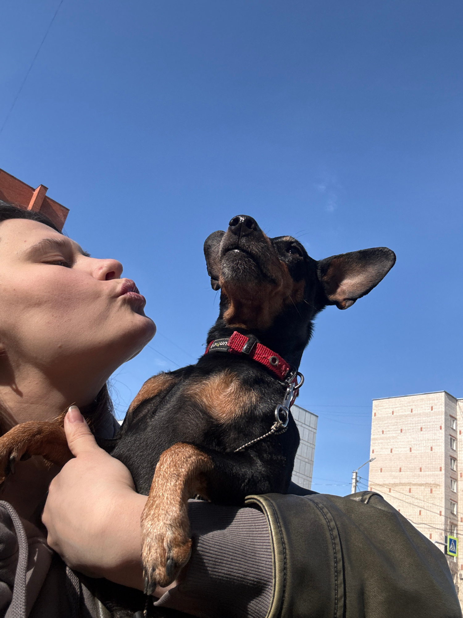 The image captures a person holding a small dog outdoors, with a vibrant blue sky dominating the left and top portions of the frame. The perspective is a low-angle shot looking upwards. On the right…read more