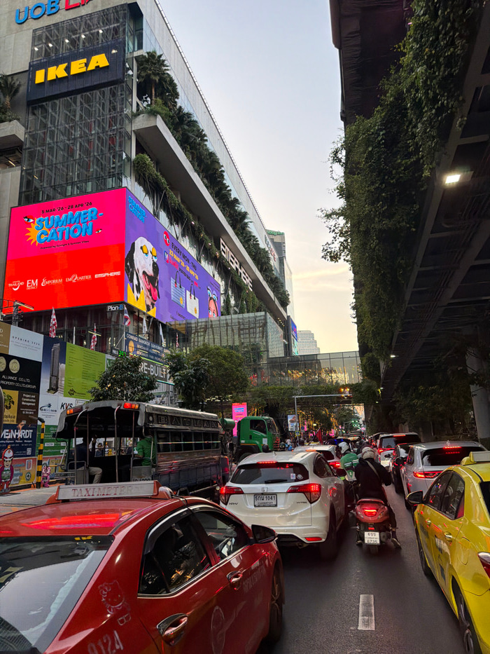 The image depicts a congested urban street scene in Bangkok, Thailand, specifically near the EmSphere shopping complex on Sukhumvit Road. The time of day appears to be late afternoon or early evening,…read more