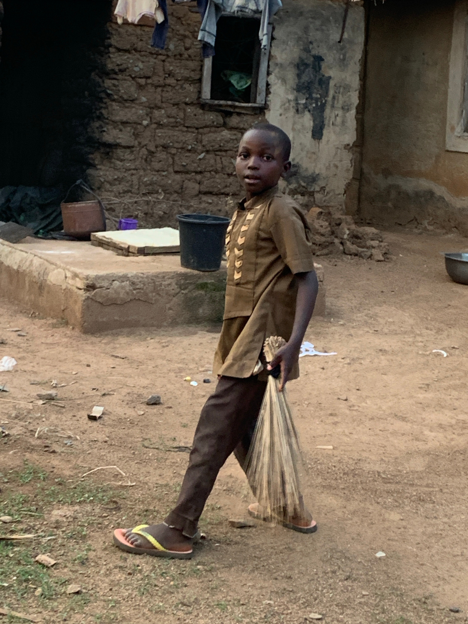 A young boy sweeps the dirt ground in Agban, Nigeria. The boy is wearing a brown shirt and pants and flip-flops. He is holding a straw broom. Behind him is a building made of mud brick. The ground is…read more