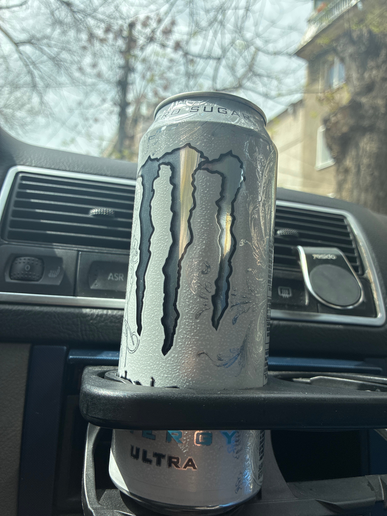 A Monster Energy Ultra Zero Sugar can sits in a car's cup holder, positioned to the right of the central dashboard vents and controls. The cup holder is black. The can is predominantly silver with theβ¦read more
