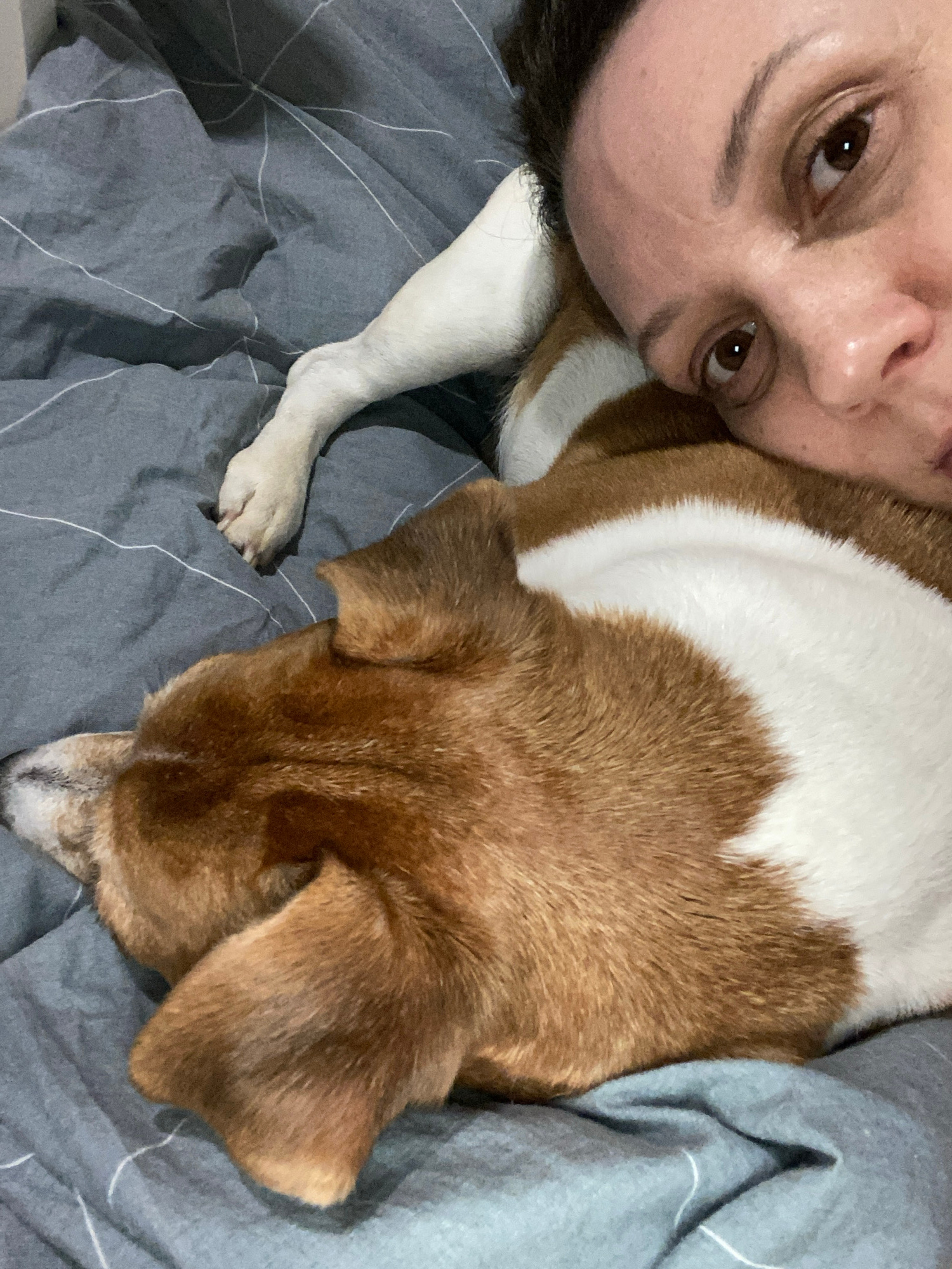 A woman and a dog are lying on a gray bed with a geometric pattern. The woman's face is close to the camera, and her gaze is directed towards the camera. A brown and white dog is lying next to her, fa…read more