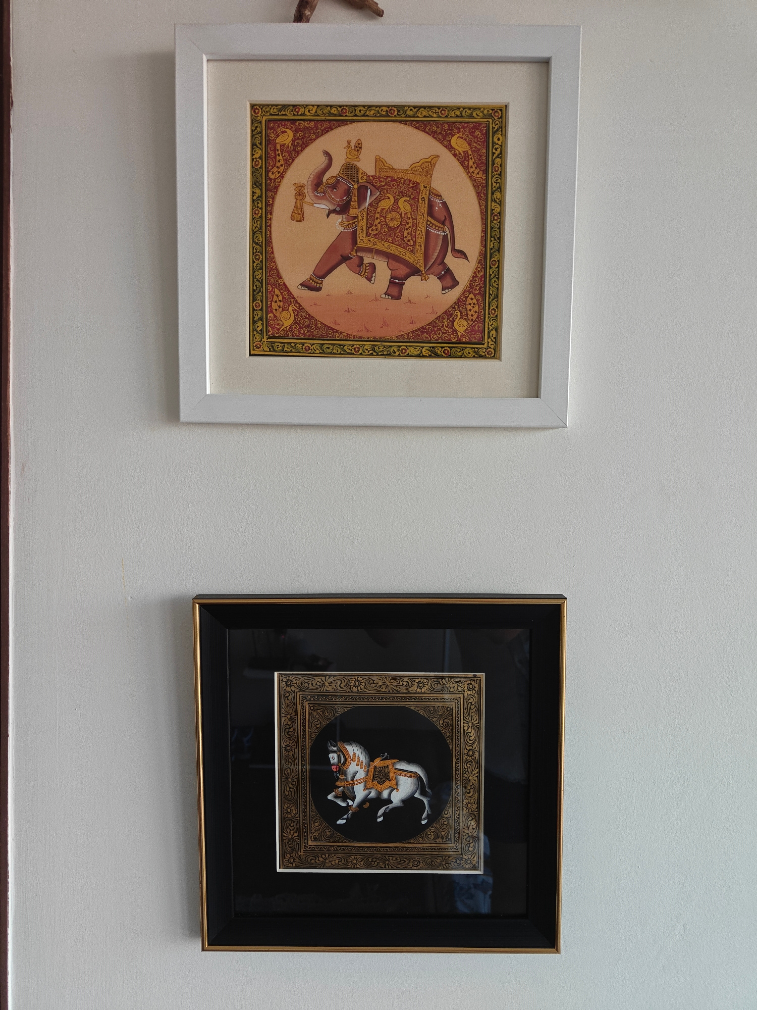 Two ornate framed artworks hang vertically on a textured off-white wall in an indoor setting. The top artwork features a white wooden frame with a wide white mat. The painting depicts a decorated eleβ¦read more