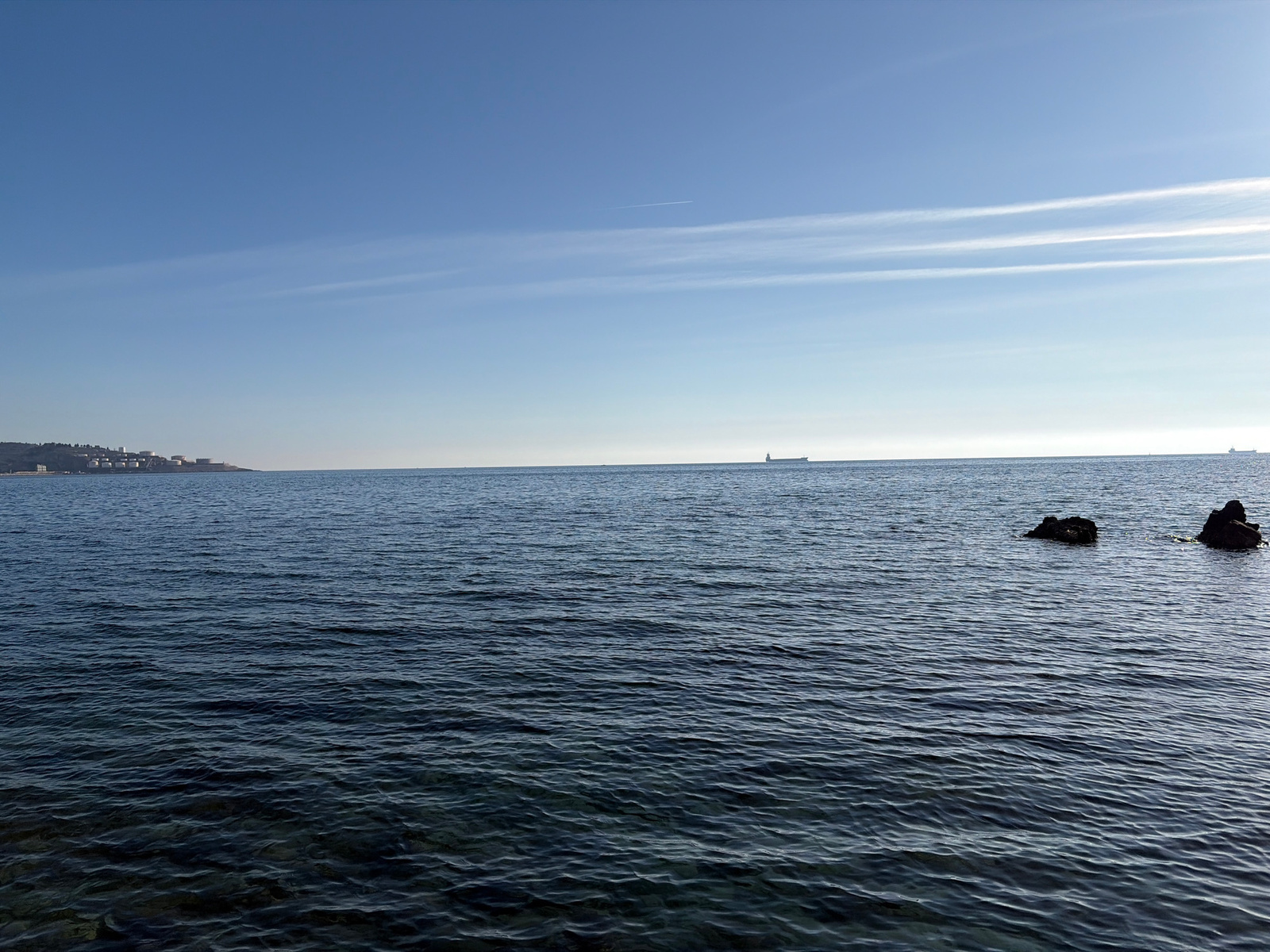 The image depicts a daytime seascape under a clear, blue sky with faint wisps of cirrus clouds. The sea is calm with gentle undulations, displaying a gradient of colors from dark blue near the foregroβ¦read more