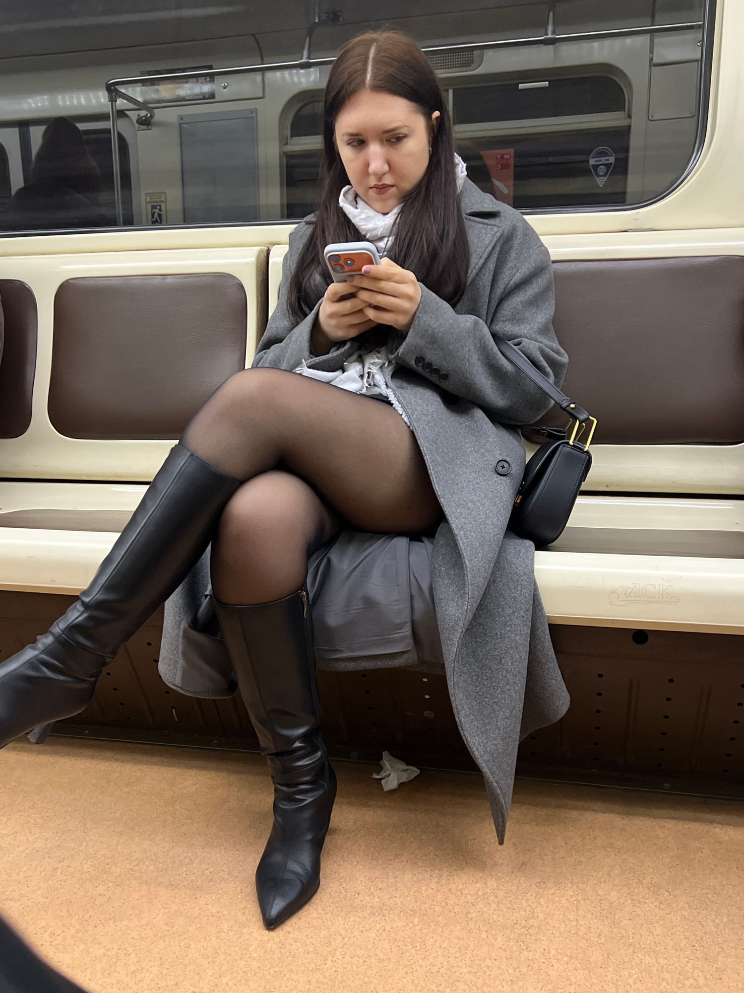 A woman is sitting on a train. She is wearing a gray coat, white shirt, black tights, and black knee-high boots. She is holding a cell phone. A black purse is on the seat next to her. The location is…read more