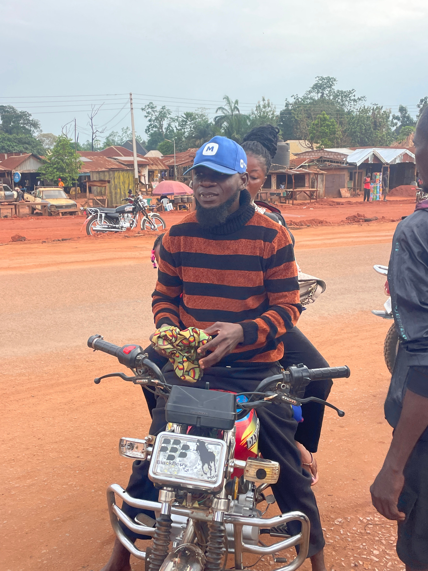 The image shows a man wearing a blue cap and a striped orange and black sweater, seated on a motorcycle in Otukpa, Nigeria. A woman is seated behind him, partially visible. The motorcycle features a r…read more