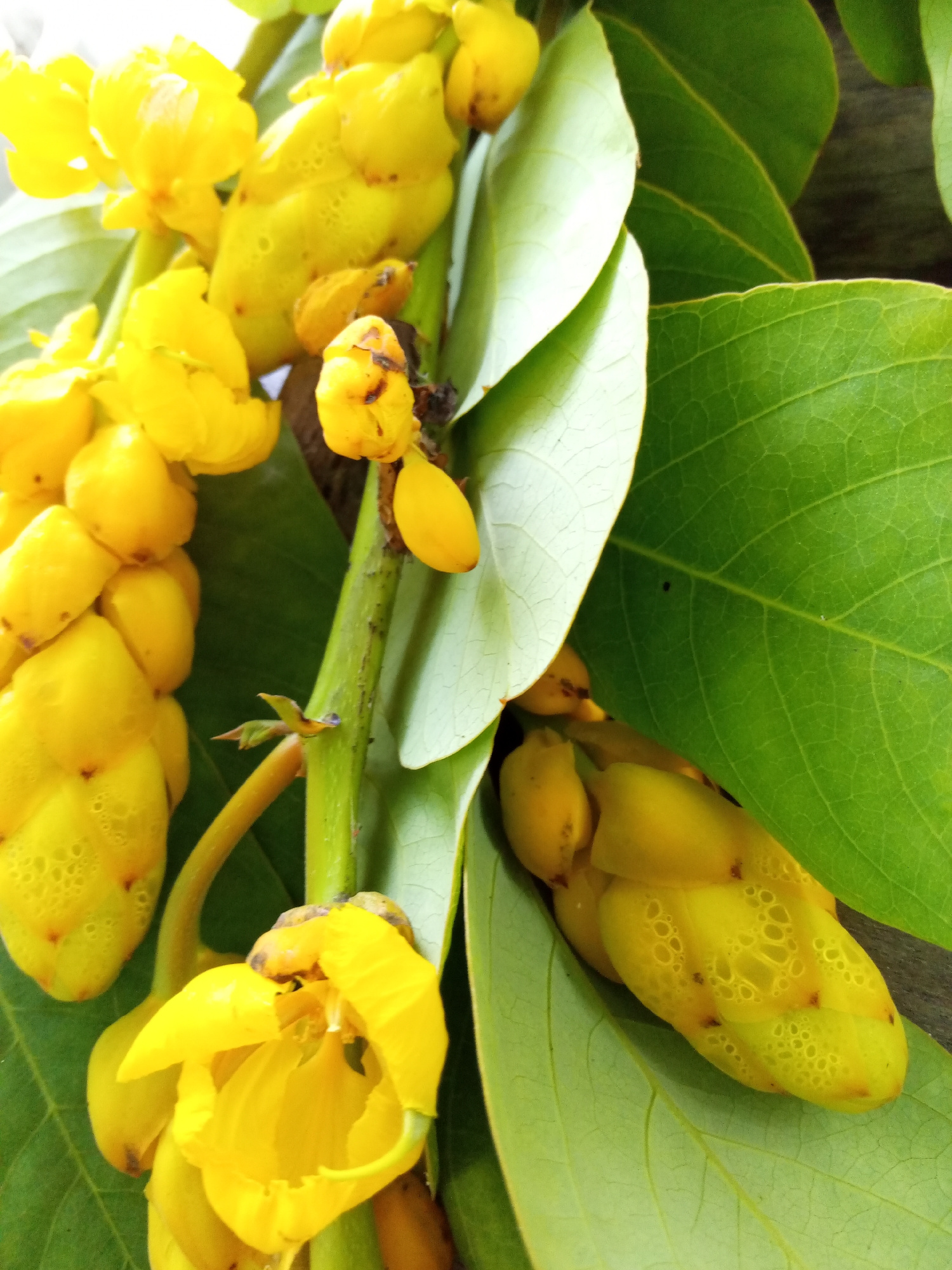 The image shows a close-up of yellow flowers and green leaves, likely taken in the Bac Natural Heritage Area Trang, Vietnam. The yellow flowers are clustered in pod-like shapes, some still closed and…read more
