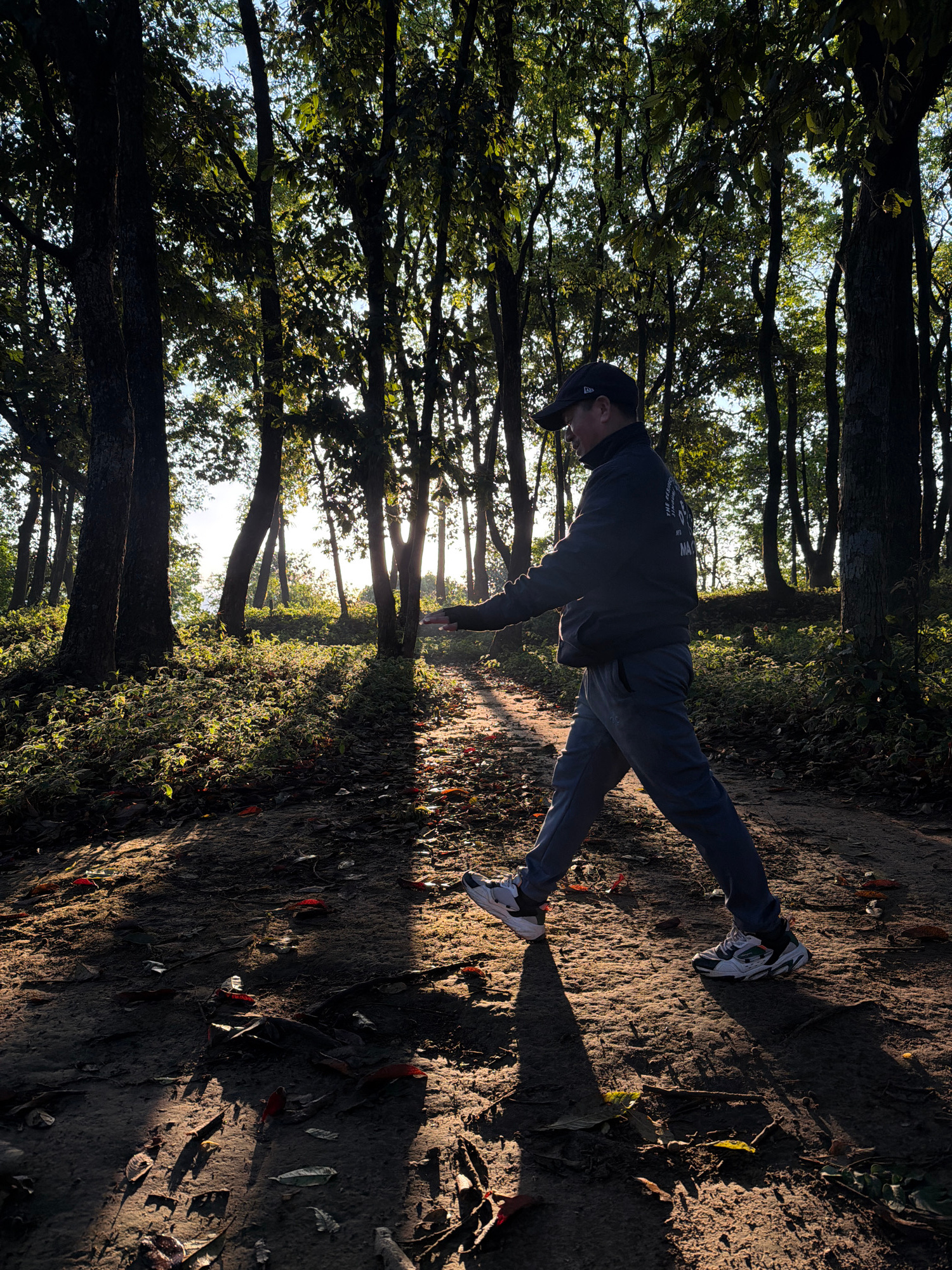 A man is performing a plank exercise outdoors. He is wearing a dark-colored long-sleeved shirt, dark pants, white athletic shoes, and a baseball cap. He is positioned on a dirt path, with his hands pl…read more