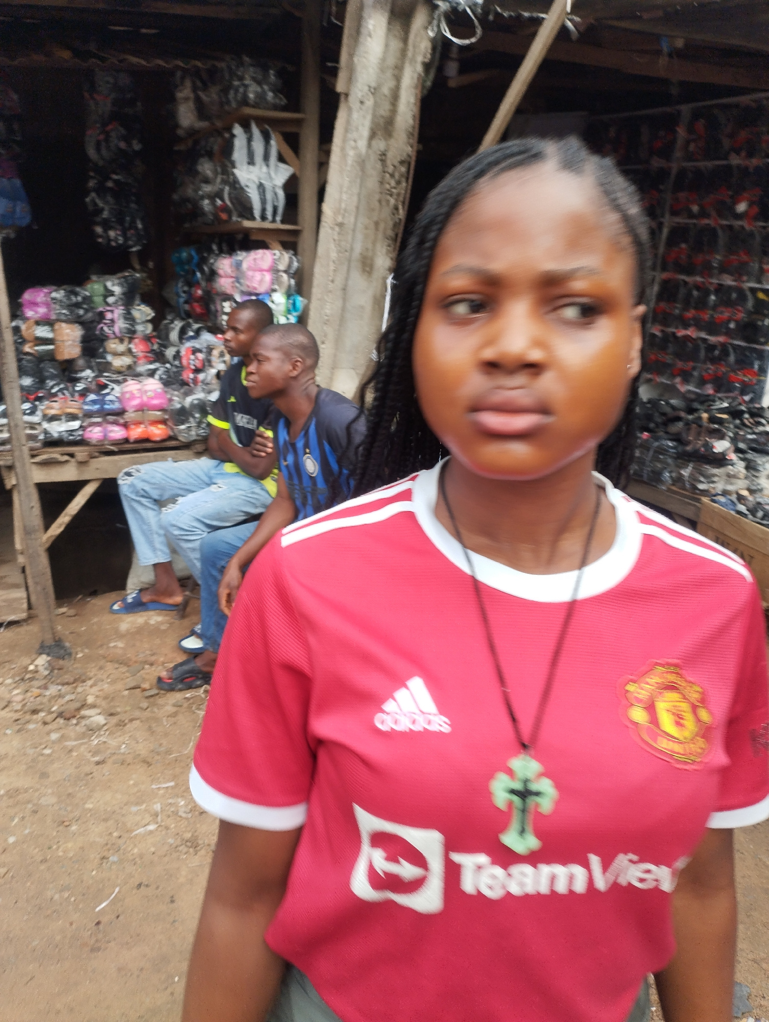The image shows a young woman wearing a red Manchester United jersey with a white trim, standing in what appears to be a market area in Fegge, Nigeria. She is wearing a green cross necklace. Behind he…read more