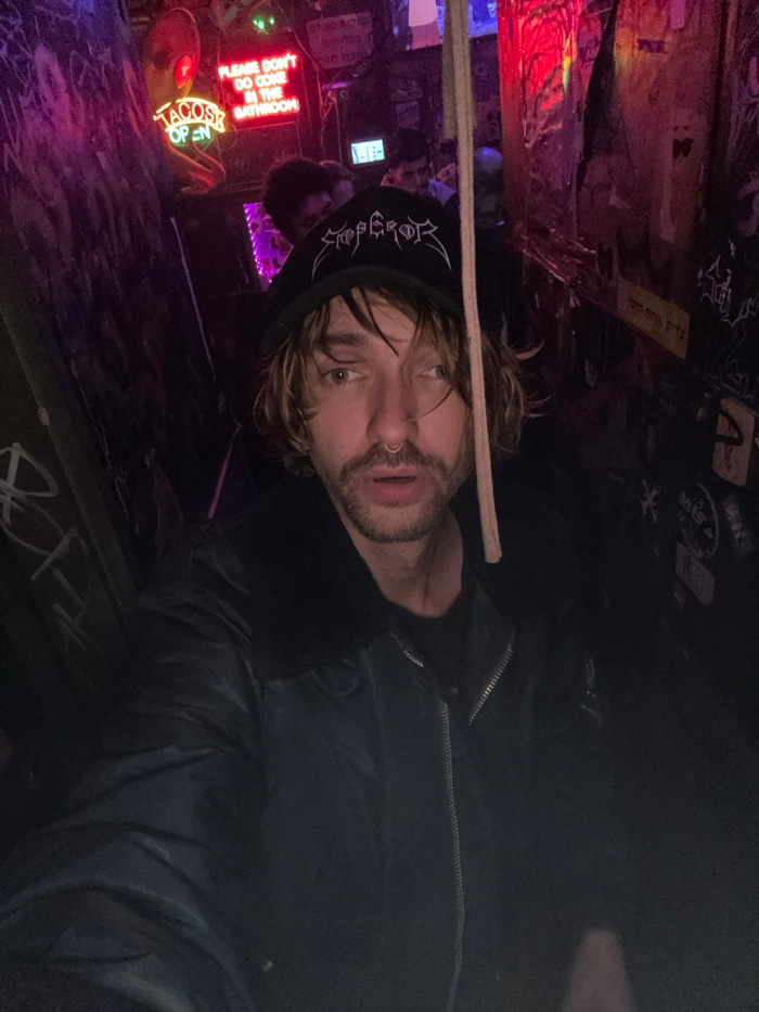 A man with shoulder-length blonde hair, a nose ring, and a goatee is wearing a black jacket and beanie. He is holding a thin, light-colored stick in front of his face. Behind him, there's a dimly lit…read more