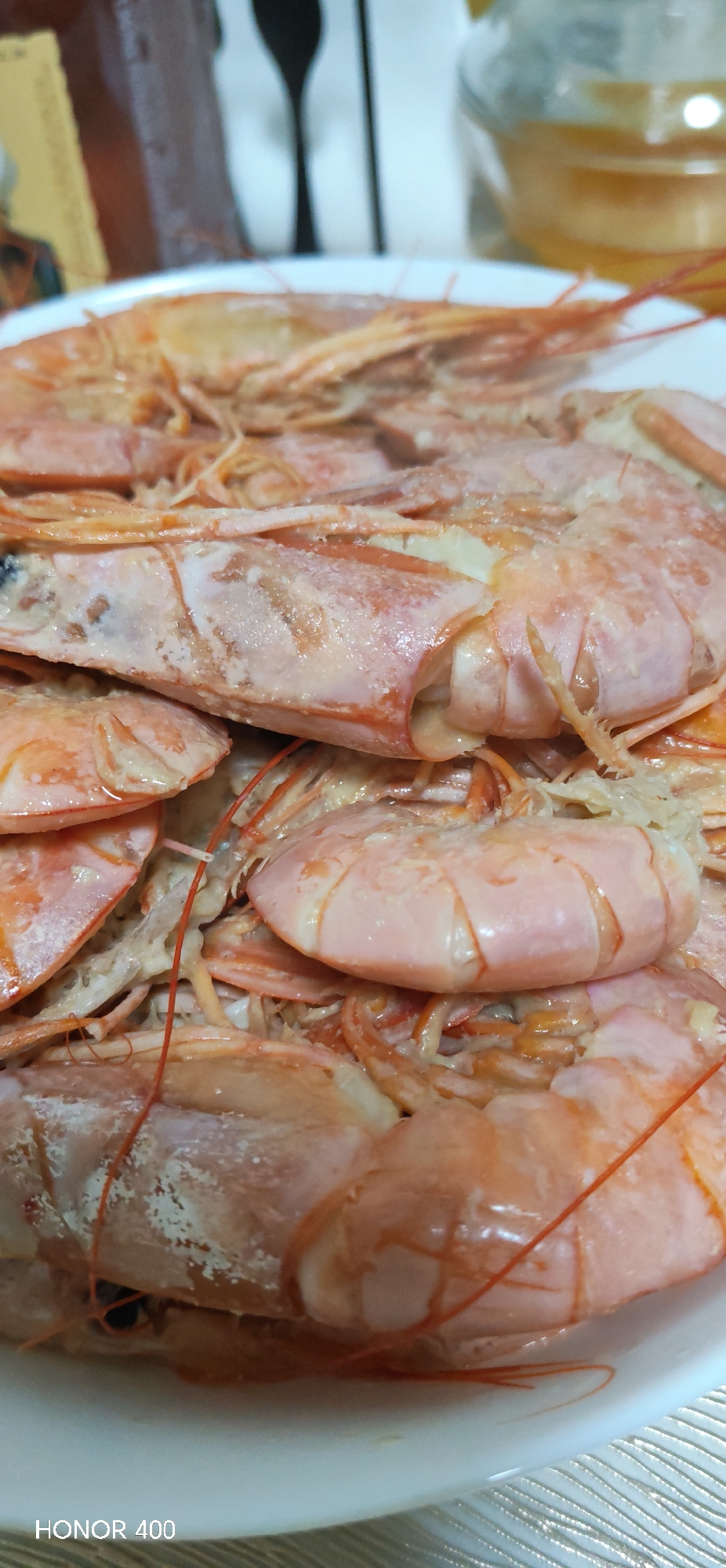 The image displays a close-up, top-down view of a serving of cooked shrimp or prawns. The subjects are piled within a white, shallow bowl or plate, which occupies the majority of the frame. The shrimp…read more