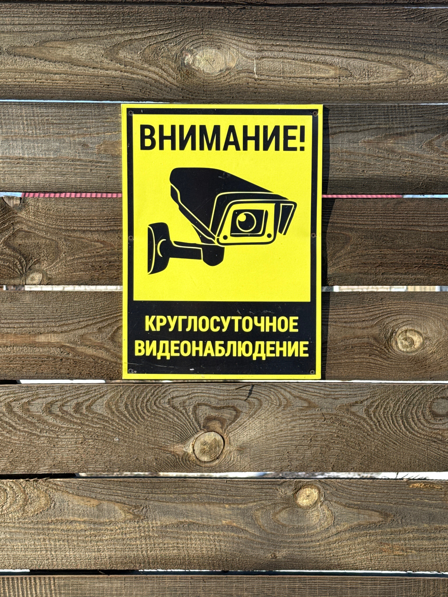 A rectangular yellow and black sign indicating "ATTENTION!" (ВНИМАНИЕ!) and "24-HOUR VIDEO SURVEILLANCE" (КРУГЛОСУТОЧНОЕ ВИДЕОНАБЛЮДЕНИЕ), along with a black graphic of a CCTV camera, is affixed with…read more