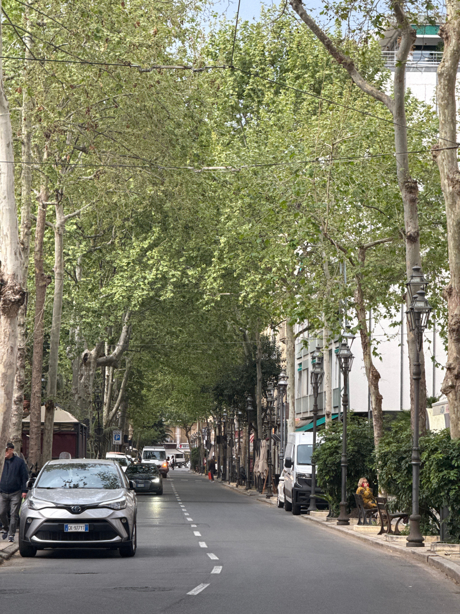 A street view of Corso Giacomo Matteotti in Sanremo, Italy, shows a silver car parked on the right side of the road. A man is standing near the car. The road is lined with trees on both sides. A perso…read more