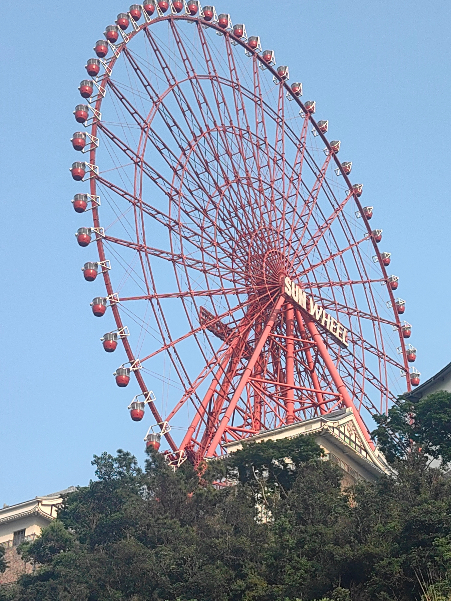This vertical shot captures a large, vibrant red Ferris wheel set against a clear, light blue sky. The Ferris wheel dominates the frame, showcasing its intricate lattice work and numerous red passenge…read more