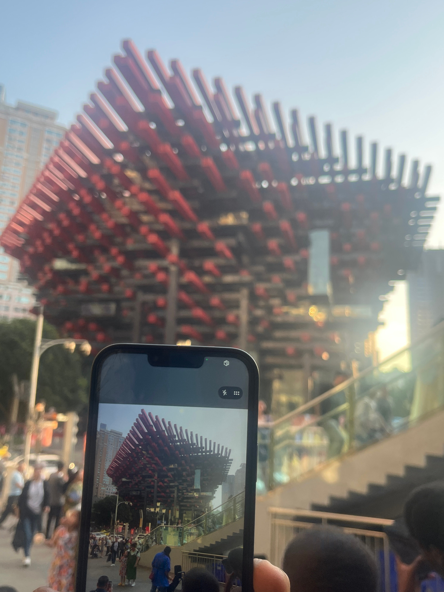A slightly blurred, medium-angle outdoor daytime shot shows a person holding a smartphone to take a picture of the "Liziba Station Pier" in Yuzhong District, China. The station, adorned with a chaotic…read more