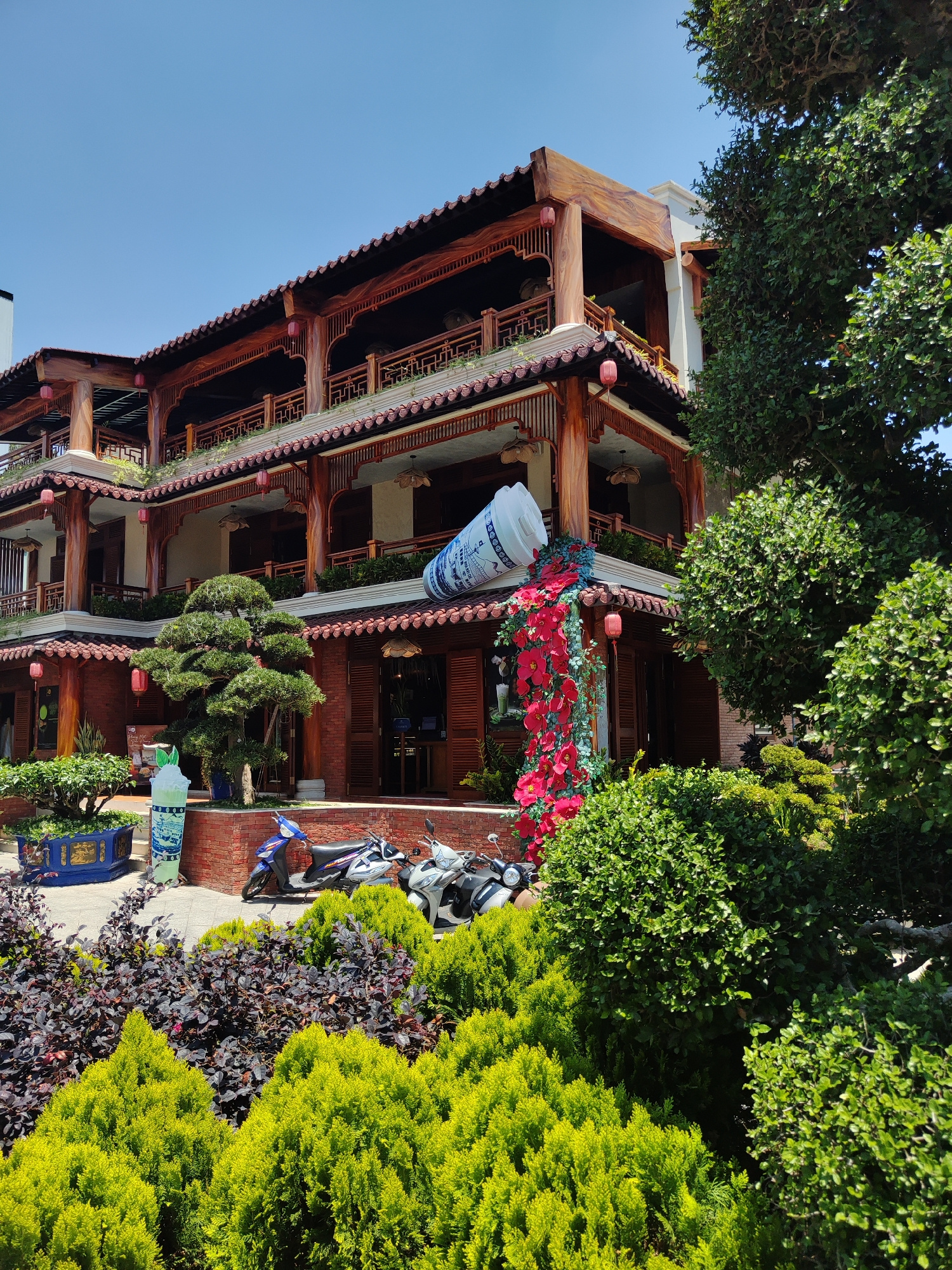 The image shows a three-story building with traditional Vietnamese architectural features located in Cam Ly - Đà Lạt, Vietnam. The building is constructed primarily of wood, with red tiled roofs, and…read more