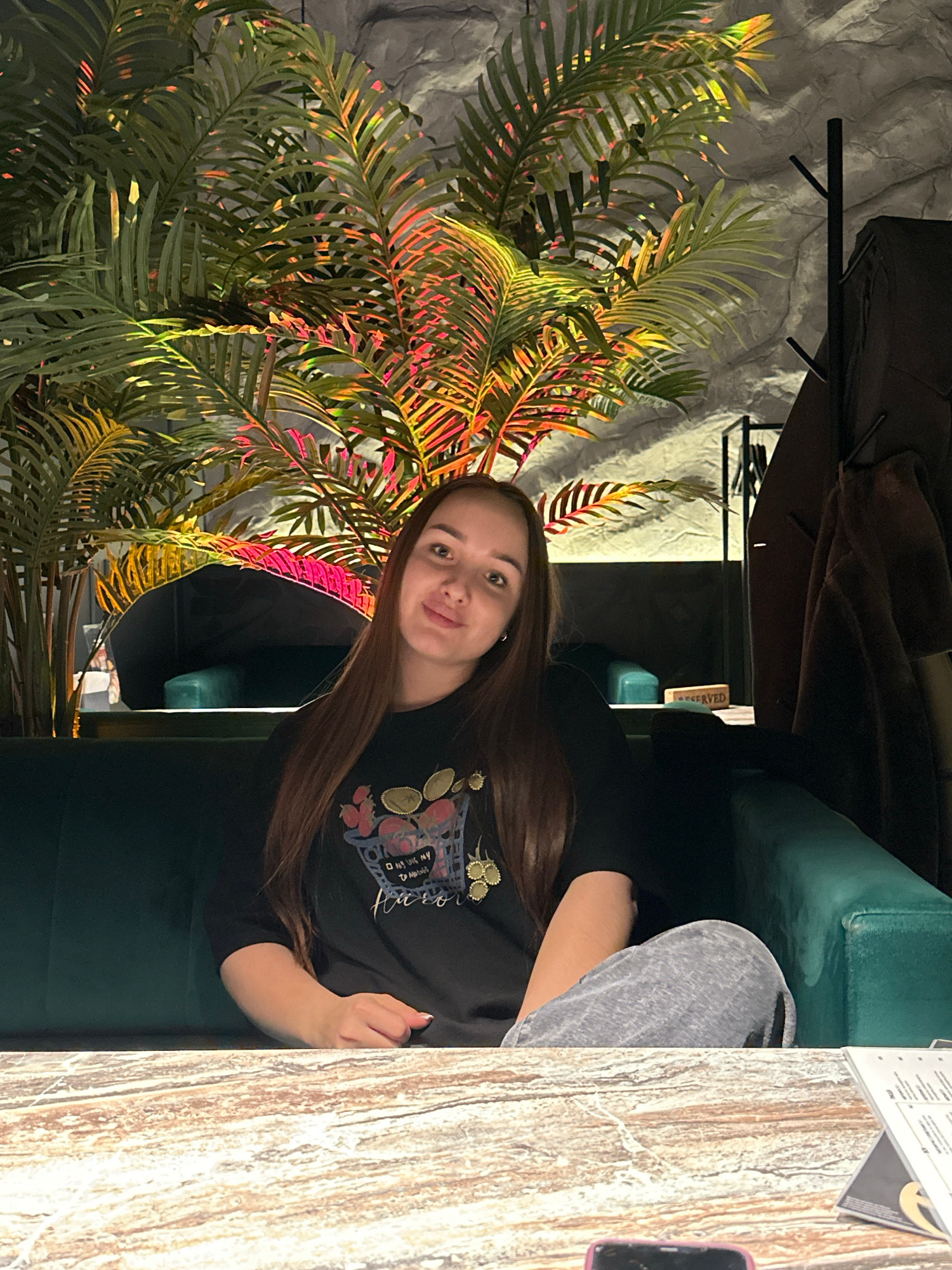A young woman with long brown hair is seated at a table in what appears to be a restaurant or cafe, likely located in Chaikovsky, Russia. She is wearing a black long-sleeved shirt with a graphic desig…read more