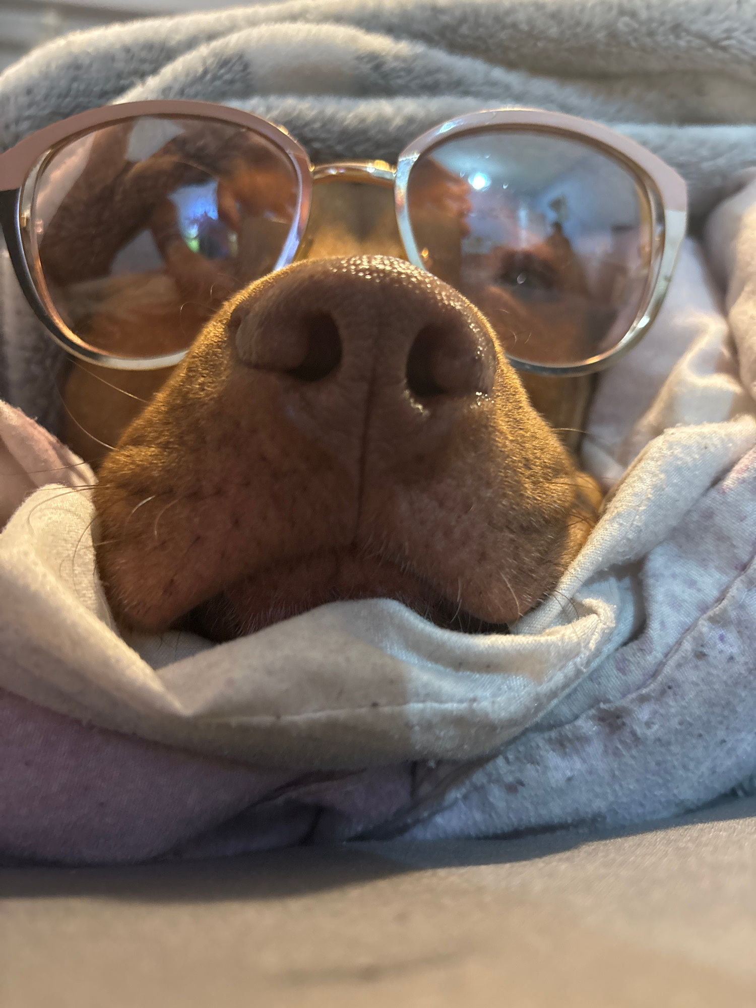 A close-up, vertically oriented shot captures the snout and upper face of a brown-furred dog, wrapped snugly in a light-colored, possibly white or light grey, blanket or hoodie. The dog appears to be…read more