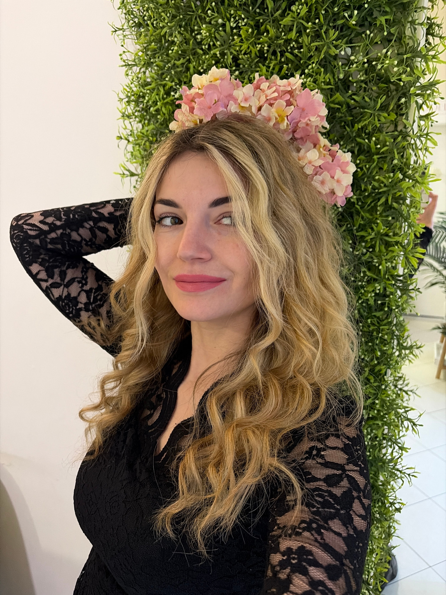 A young woman with blonde, wavy hair and a flower crown poses indoors against a backdrop of artificial greenery. She wears a black lace top or dress. The setting appears to be a brightly lit room. The…read more