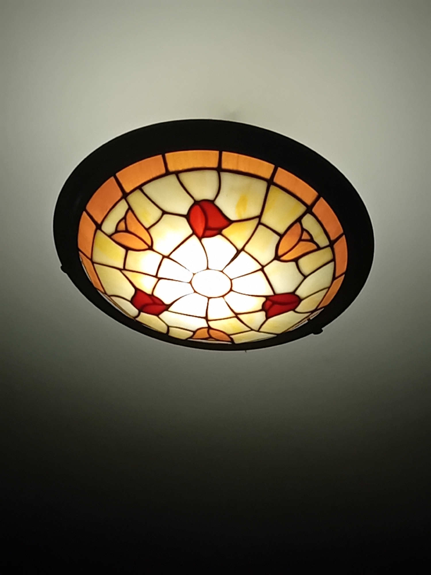 A round, stained-glass light fixture is mounted on a wall. The fixture has a dark frame surrounding the stained-glass. The stained glass design features a central circular pattern with radiating lines…read more