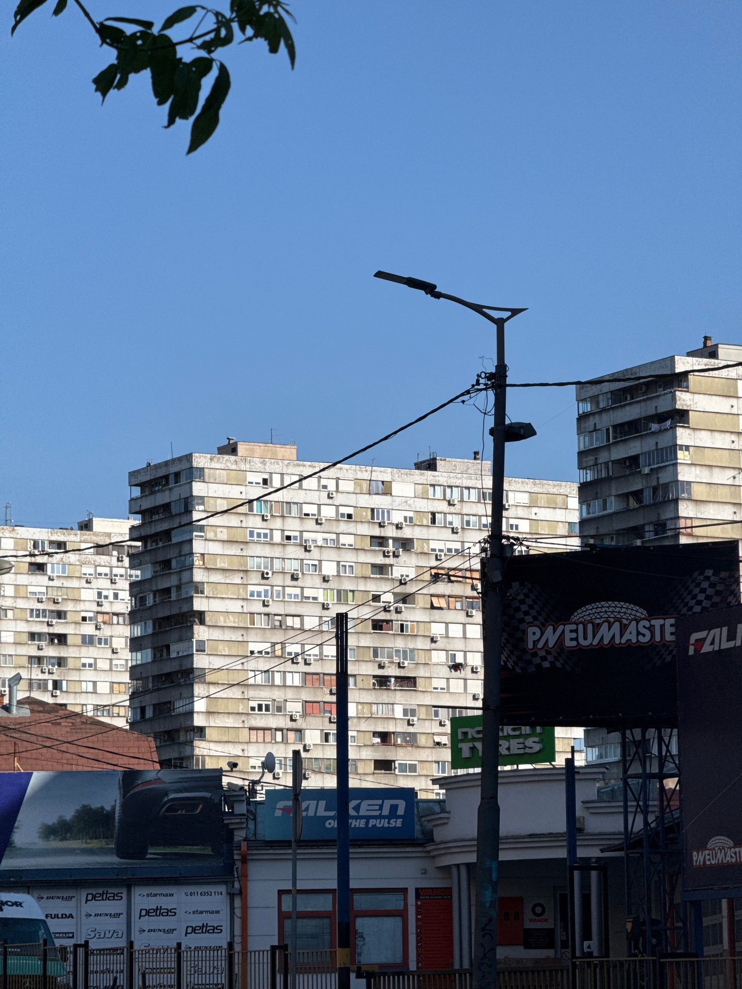 This media file captures an urban street scene dominated by tall, multi-story apartment buildings under a clear blue sky. The buildings feature numerous windows, almost all equipped with external air…read more