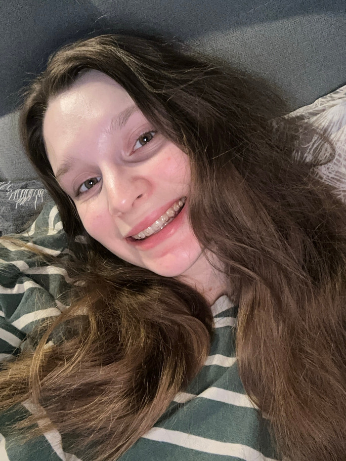 A woman with long, light brown hair smiles while lying down. She wears clear braces on her teeth. Her eyes are light brown. She's on a gray couch to the left and a green and white striped surface to t…read more