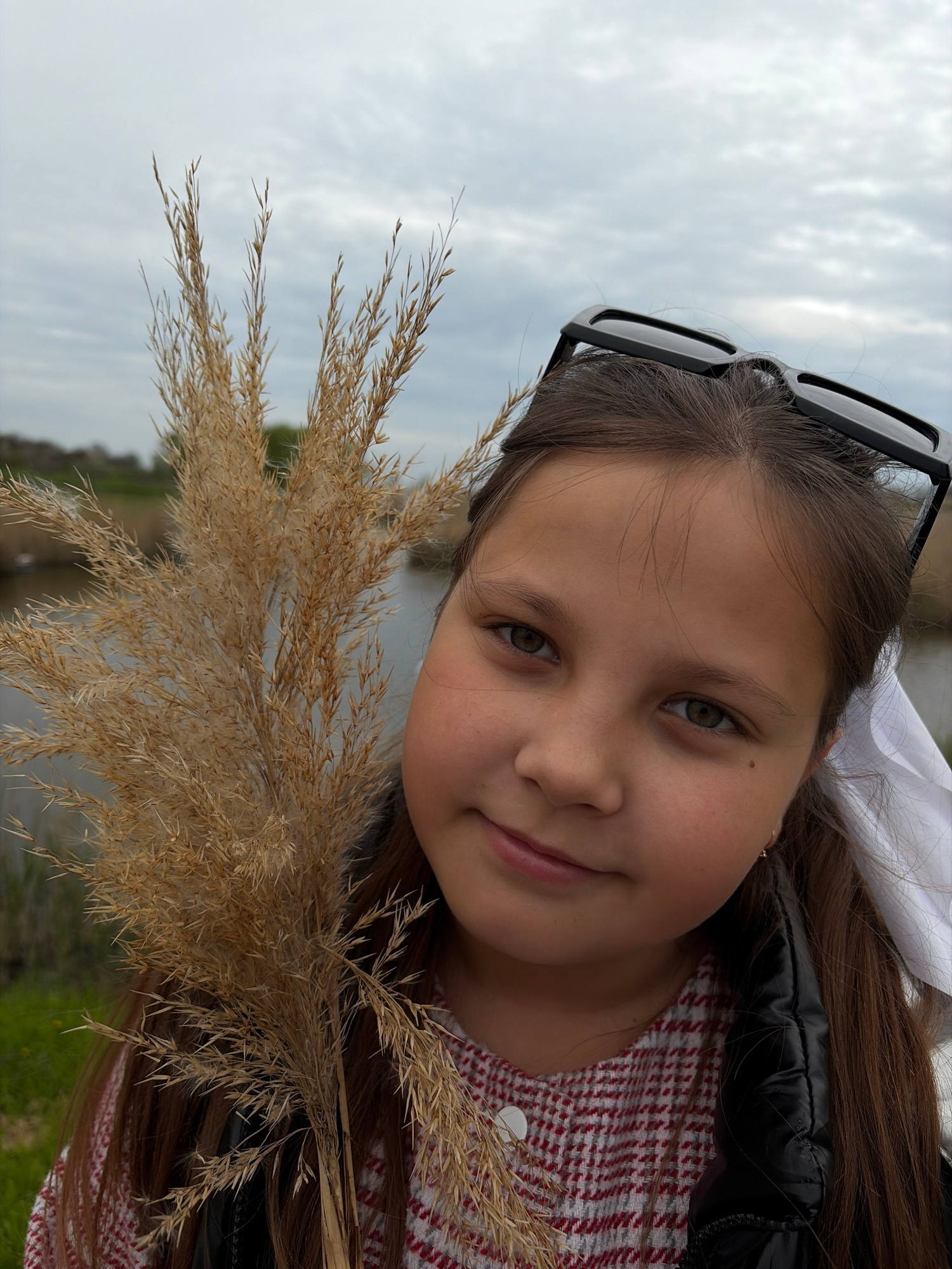A young girl with brown hair and green eyes is holding a bouquet of dried reeds. She is wearing a red and white patterned dress and a black jacket. Sunglasses are perched on her head, and a white bow…read more