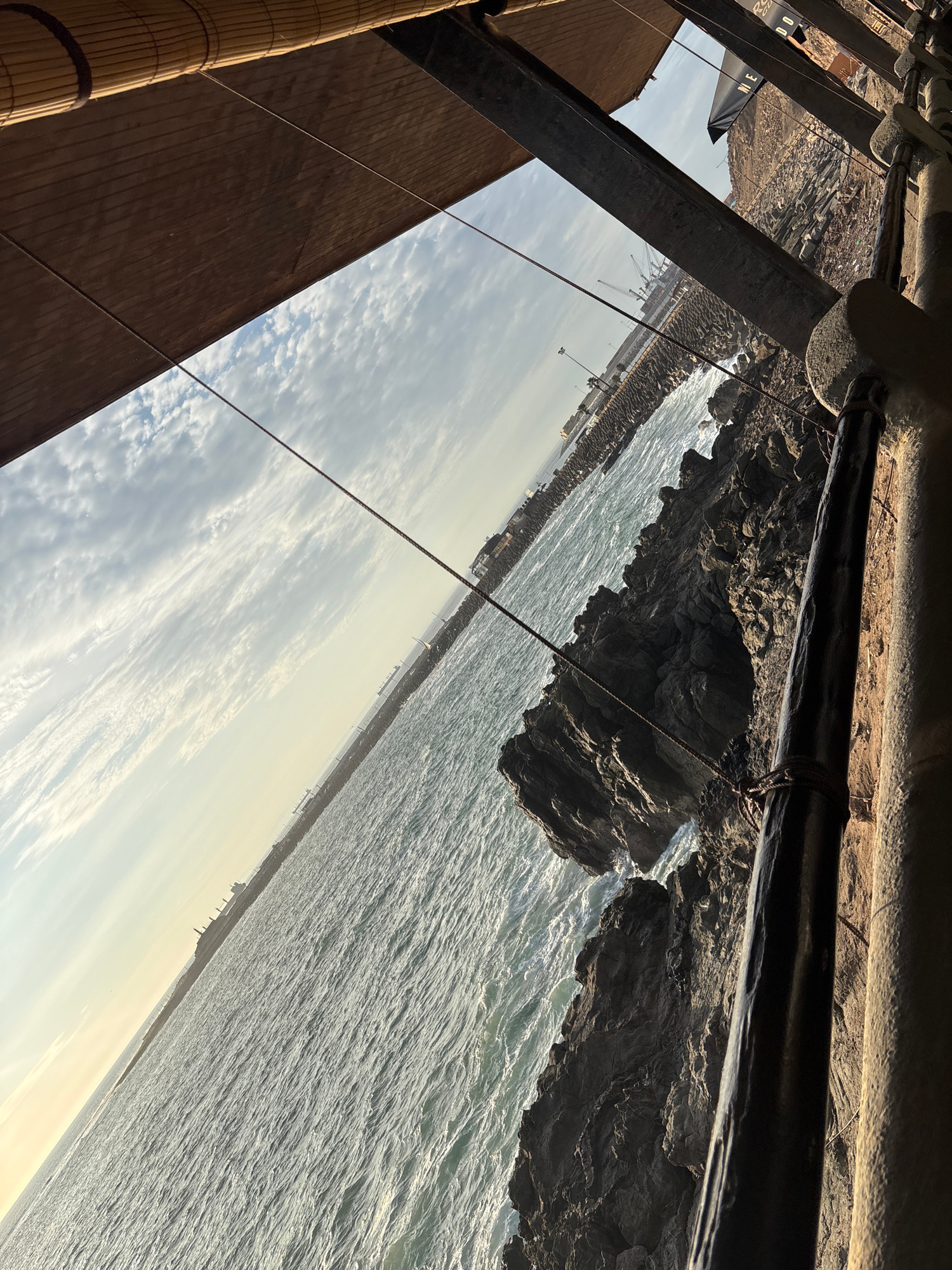 The image captures a panoramic coastal scene from an elevated perspective, looking out towards the ocean and a distant city under a partly cloudy sky. The photograph is significantly tilted counter-cl…read more