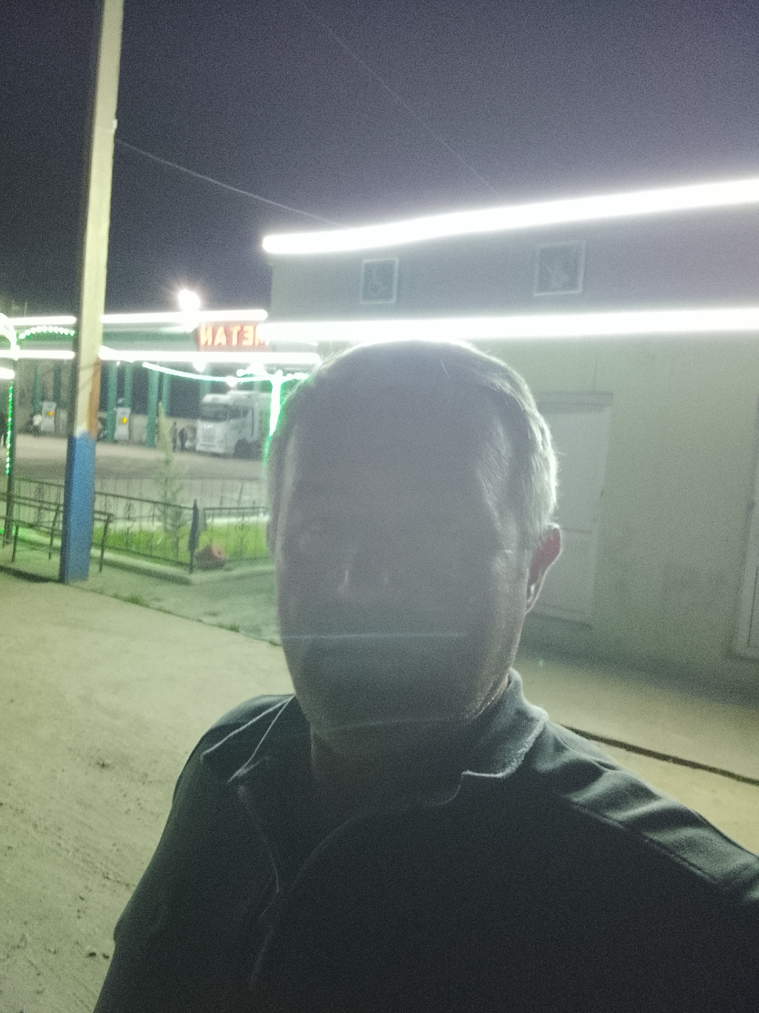 The image is a self-portrait of a middle-aged man with a blurry face due to lighting conditions. He is wearing a dark collared shirt. Behind him is a brightly lit building, possibly a gas station, wit…read more
