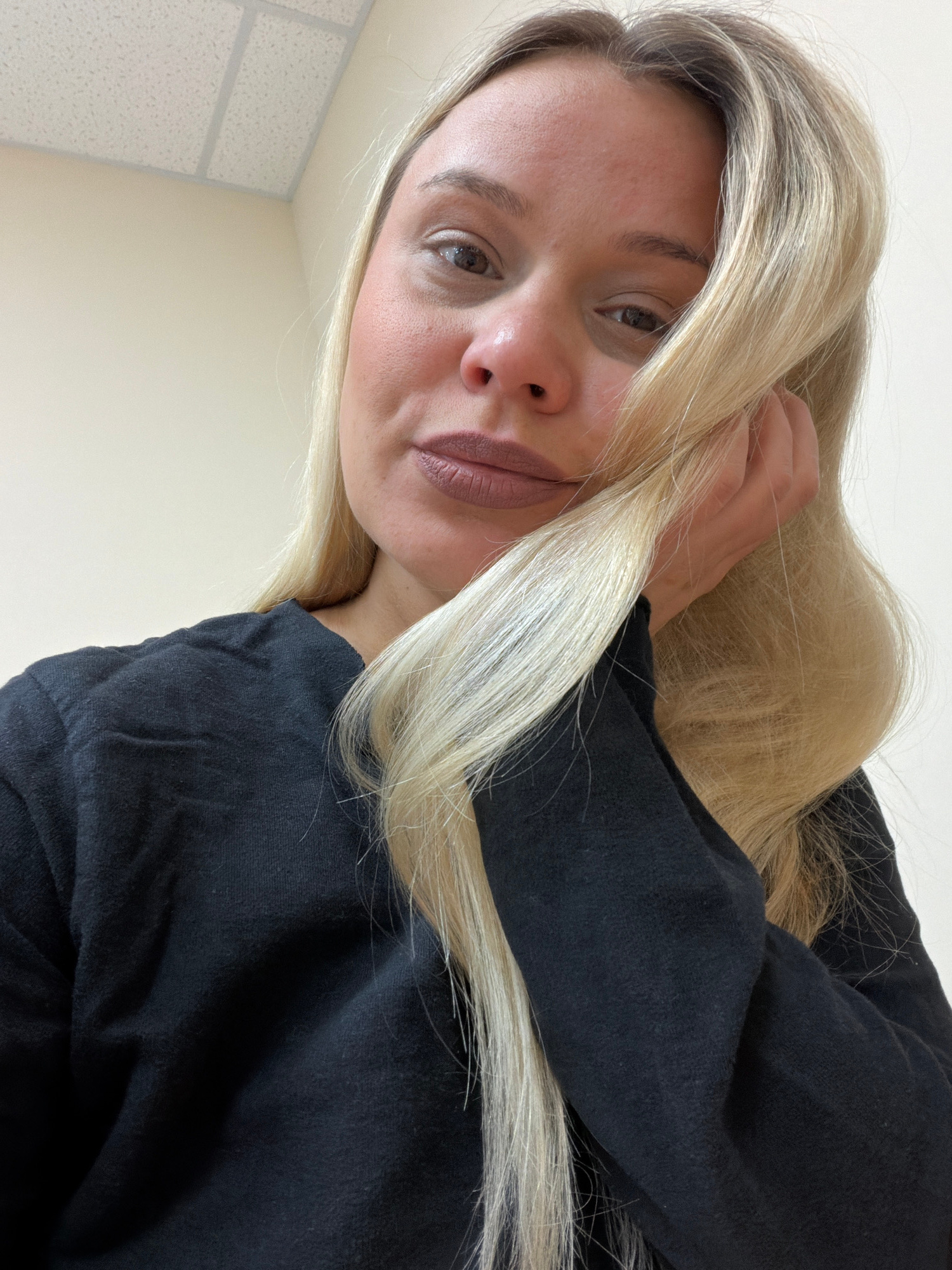 A woman with blonde hair, wearing a black long-sleeve shirt, is looking down at the camera. The background appears to be an interior space with a beige wall and a ceiling with textured tiles. The loca…read more