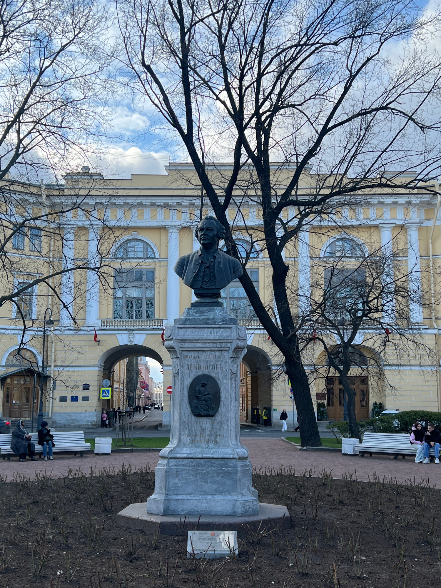 The image shows a monument to Mikhail Lomonosov, a Russian polymath, in Saint Petersburg, Russia. The monument, featuring a bust of Lomonosov, stands in front of the Kunstkamera, a museum of anthropol…read more