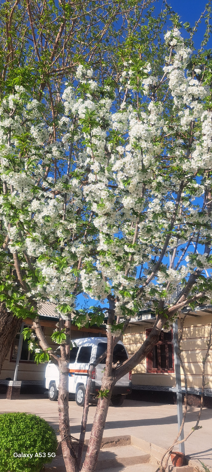 The image depicts a tree in full bloom with white flowers, likely in the city of Katta-Ravat, Uzbekistan. The tree is the focal point, its branches covered with a dense canopy of blossoms. Patches of…read more